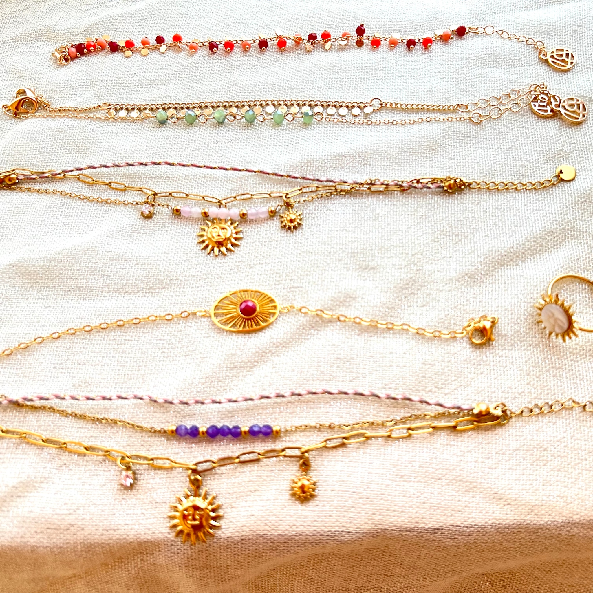 プロヴァンスの陶器やアイアンワークにある太陽の顔は、悪い運気や邪気を遠ざけるとされます。 家の門や壁に飾り「家族の繁栄」という意味も。 やわらかな光を手元に宿す、太陽のアクセサリーを選びました!