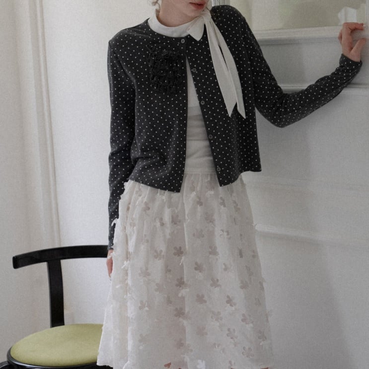 レトロな可愛らしさのgray polka dot knit cardigan。