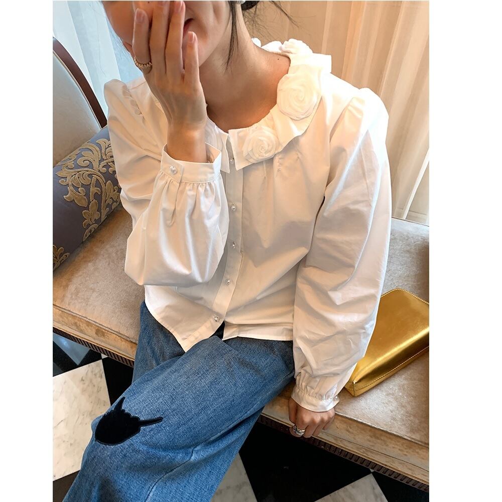 大人可愛い可憐なホワイトブラウス。ジャケットやカーデに合わせても素敵です。