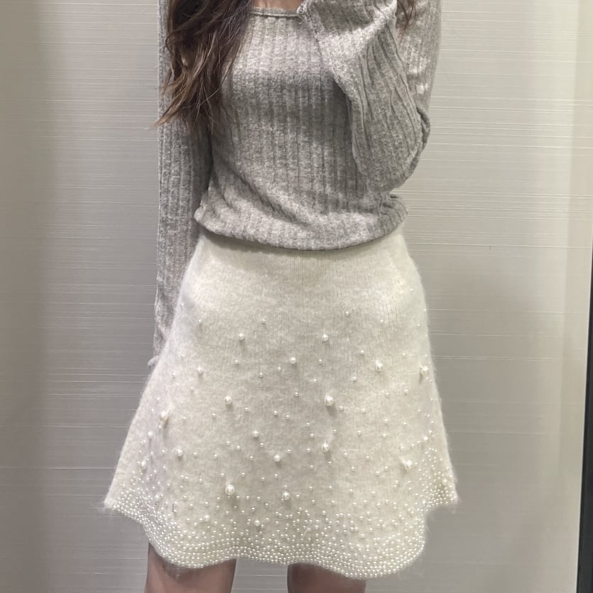 洗練されたフェミニニティとモダンな魅力が織りなすelegant pearl-decorated round-neck knit sweater top,mini skirt。