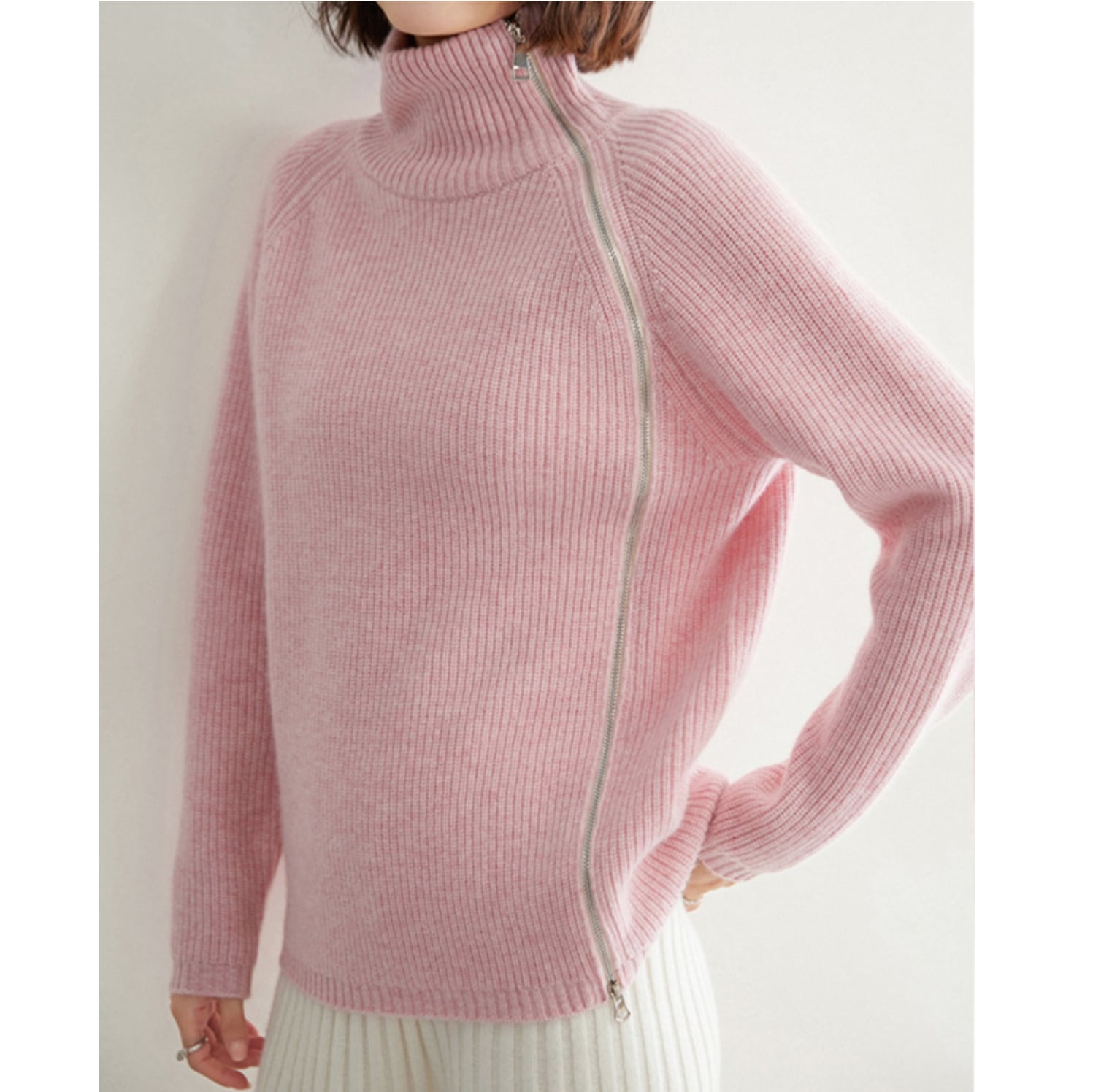 甘すぎない大人ピンクのジップアップハイネックニット。