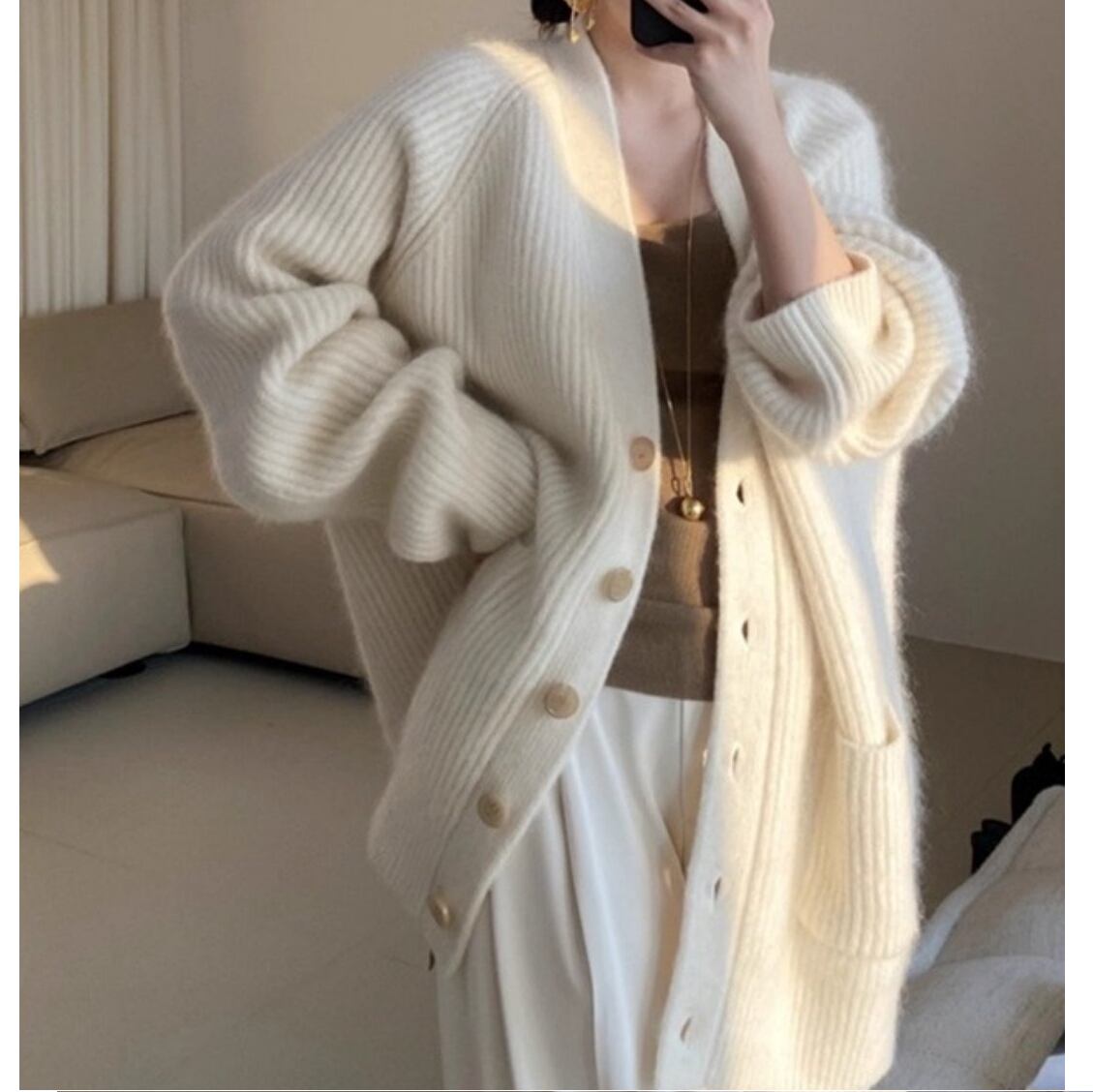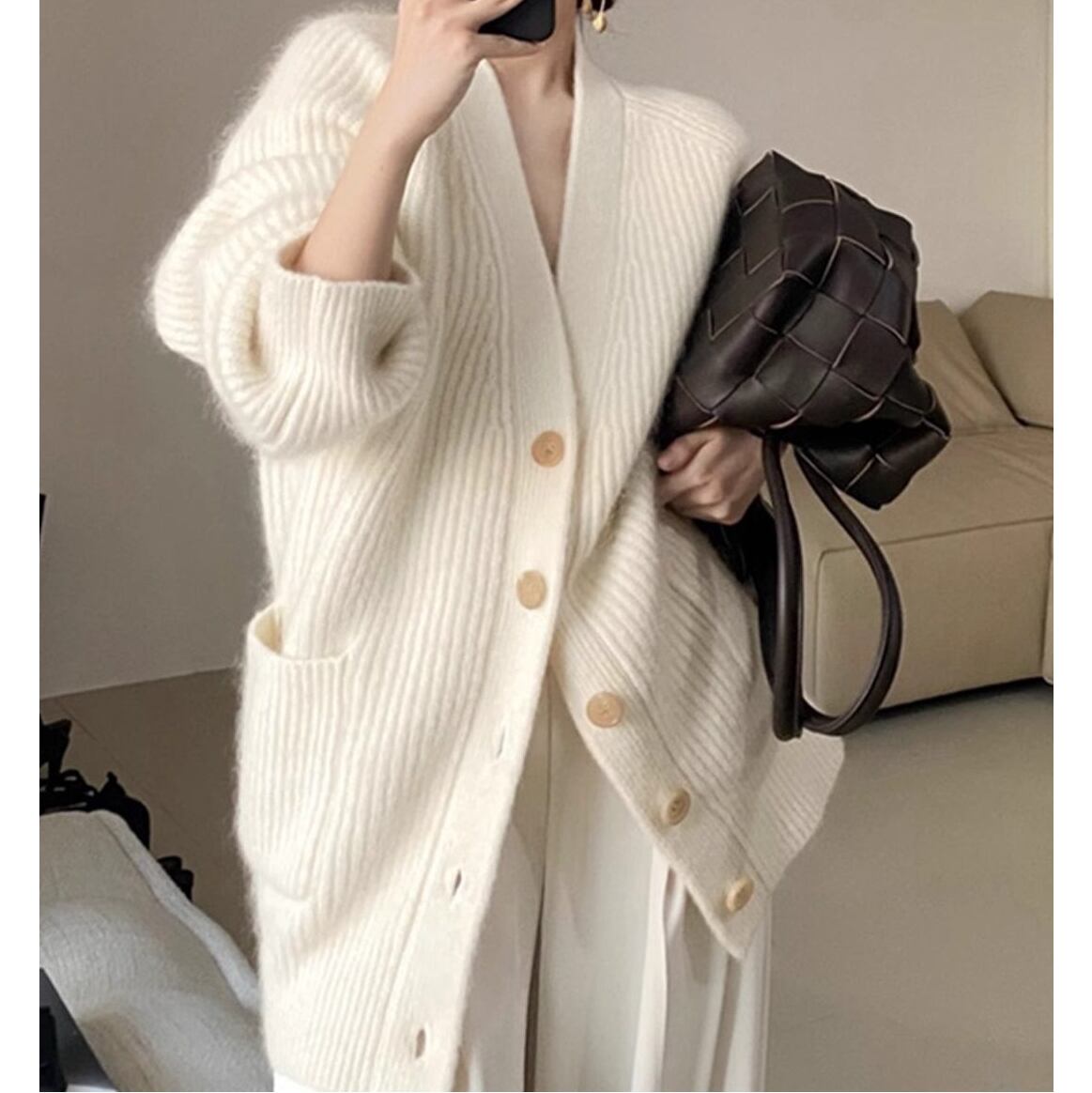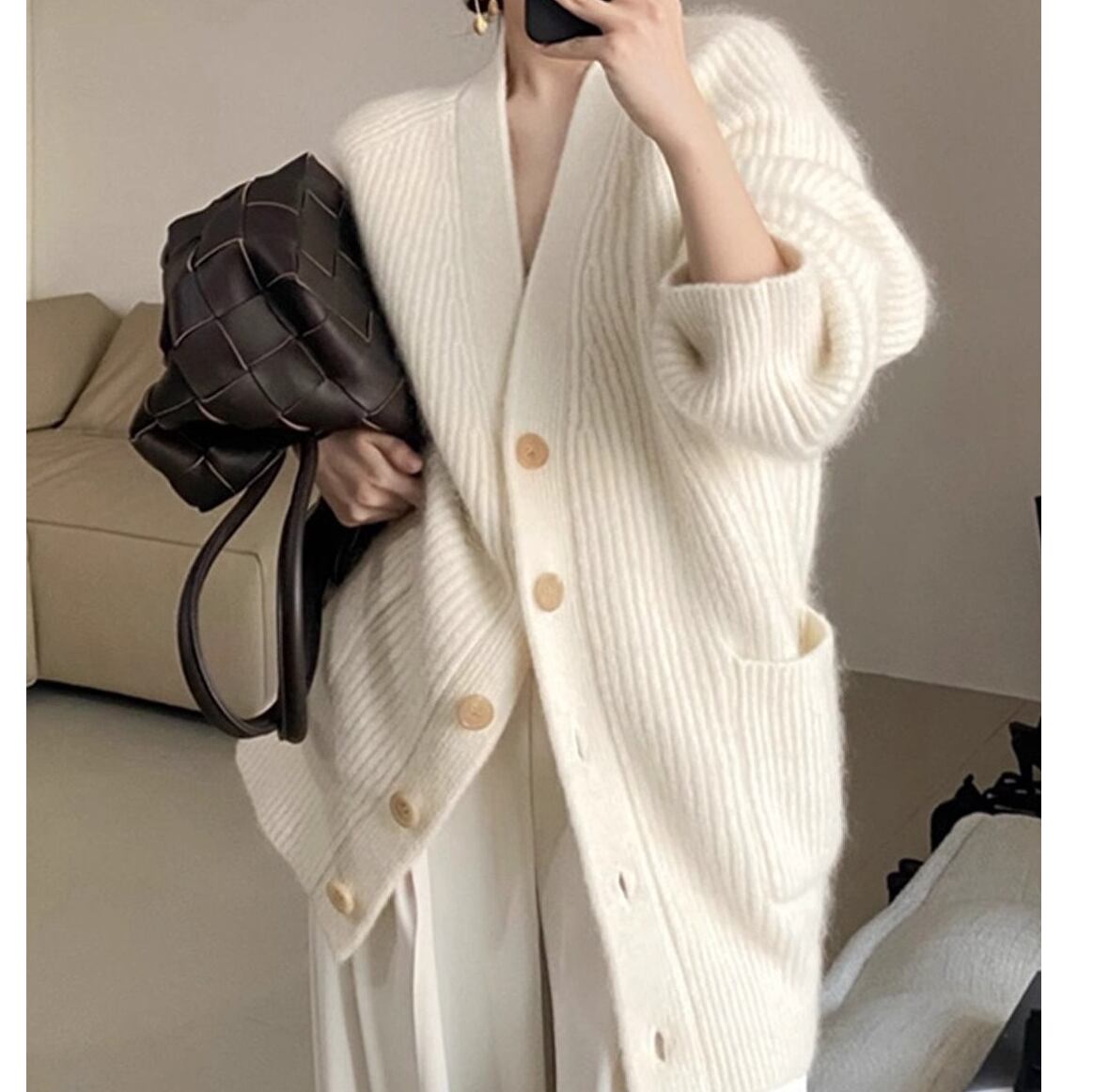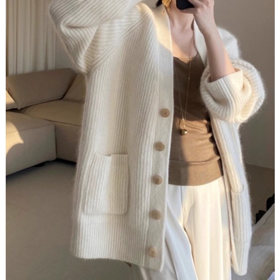 心地よい大人のロングVネックニットカーディガン。