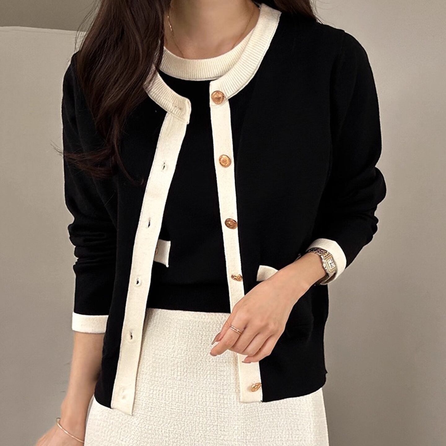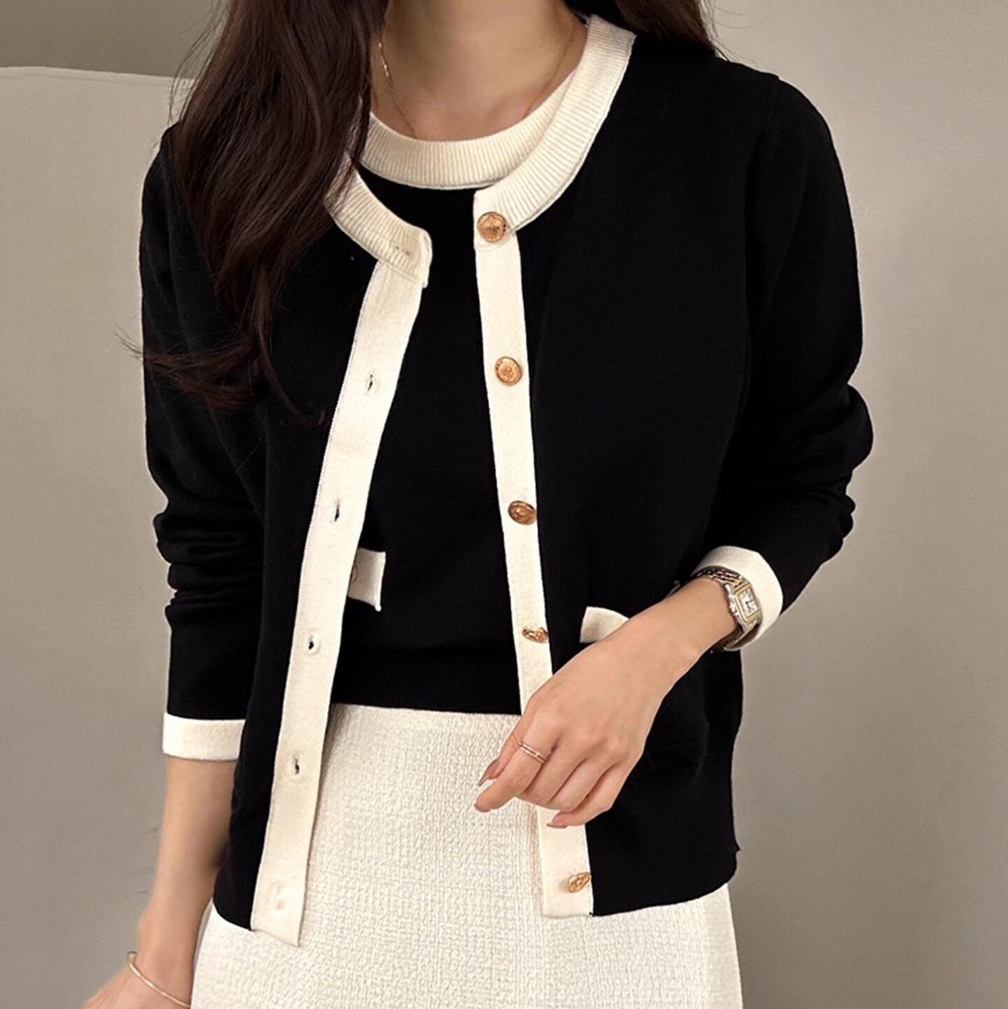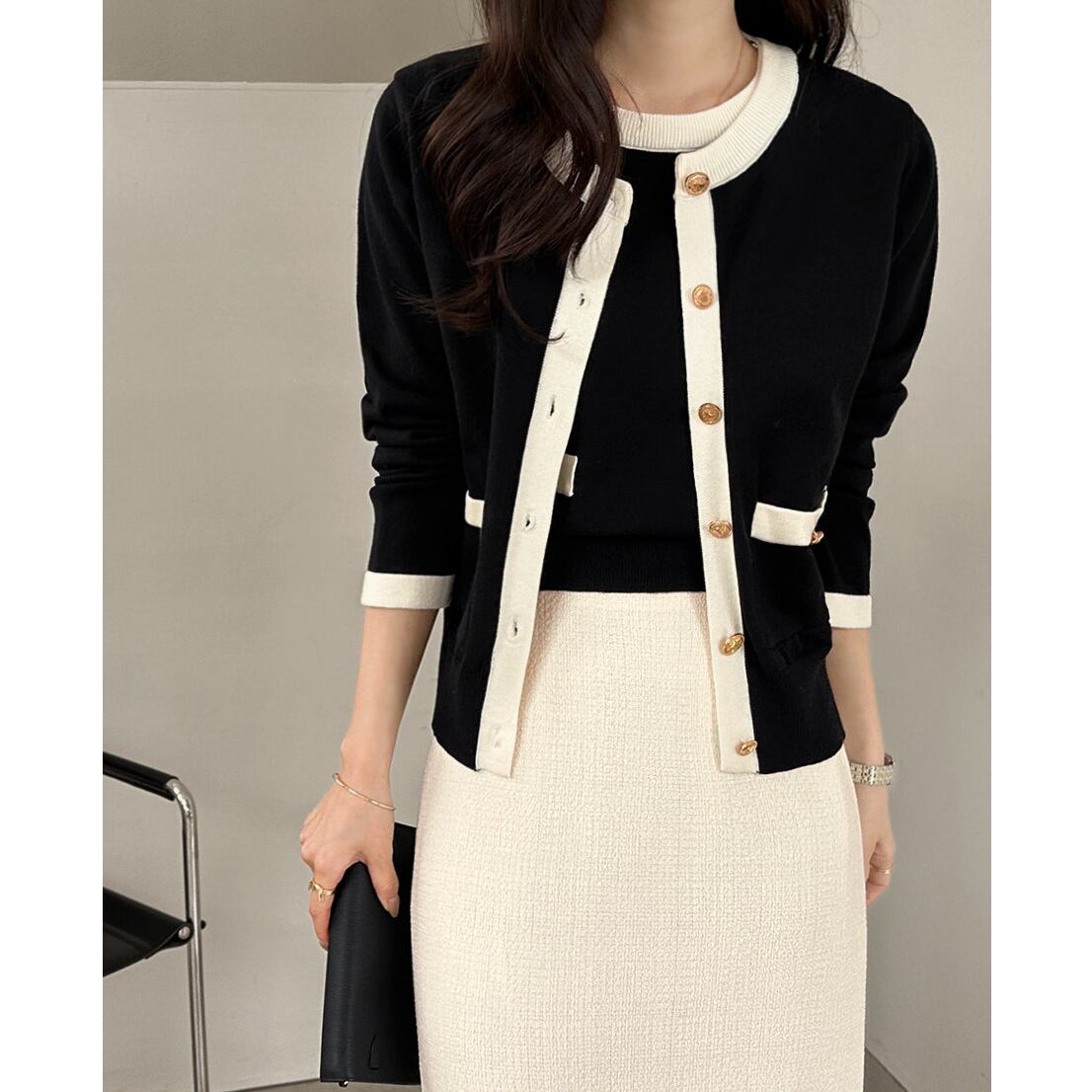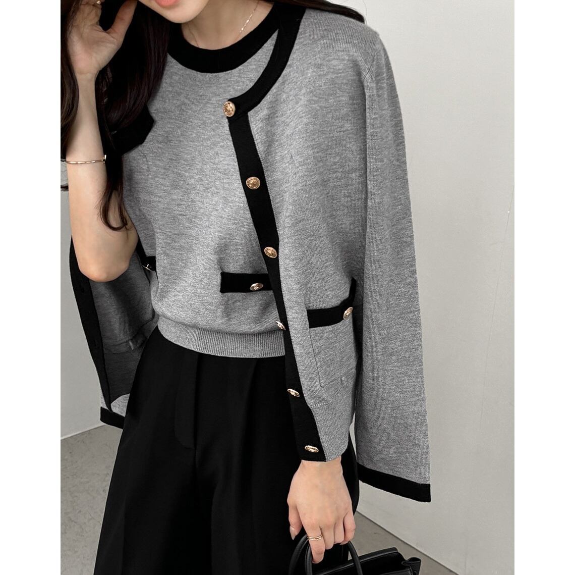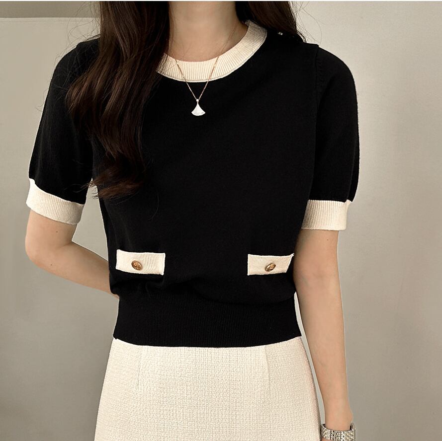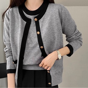 オンオフ問わず使える上品なcontrast color knit cardigan set with short sleeve top。