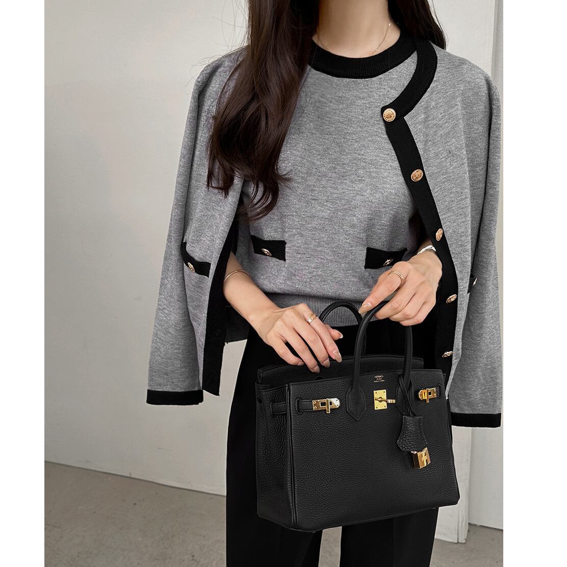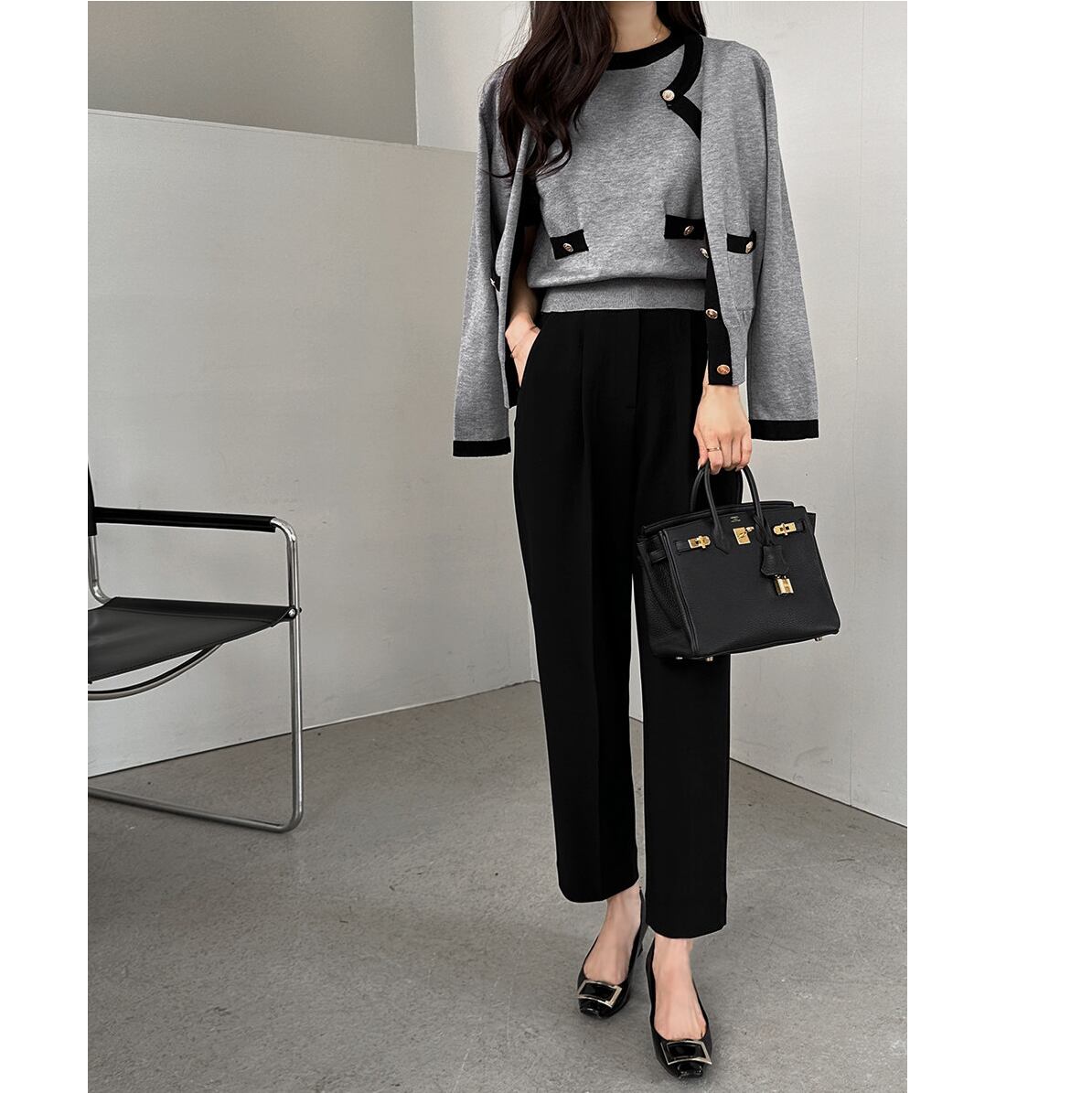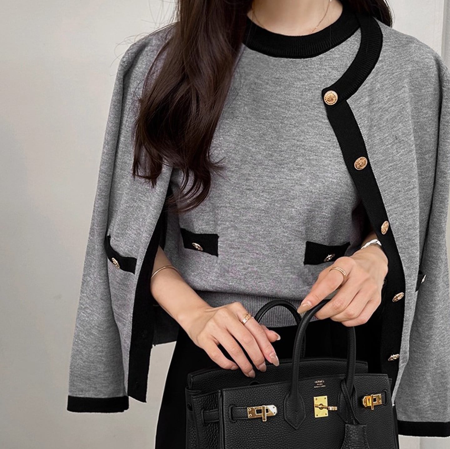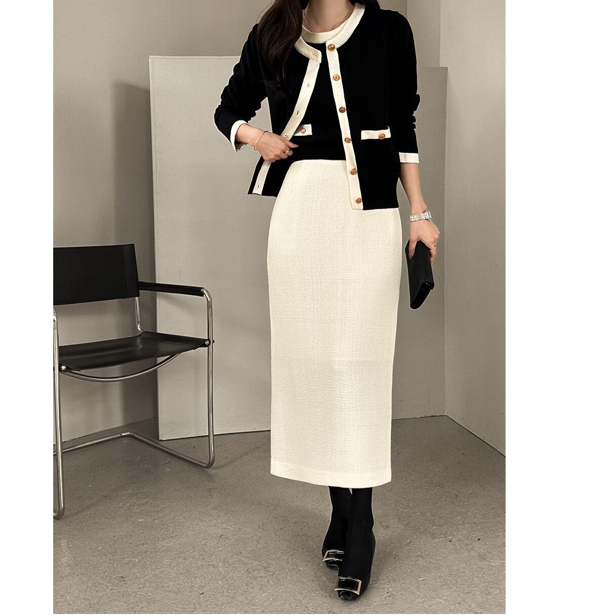 オンオフ問わず使える上品なcontrast color knit cardigan set with short sleeve top。