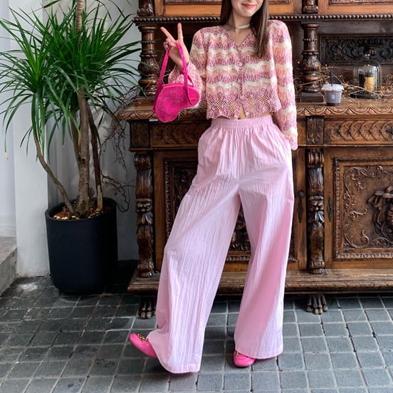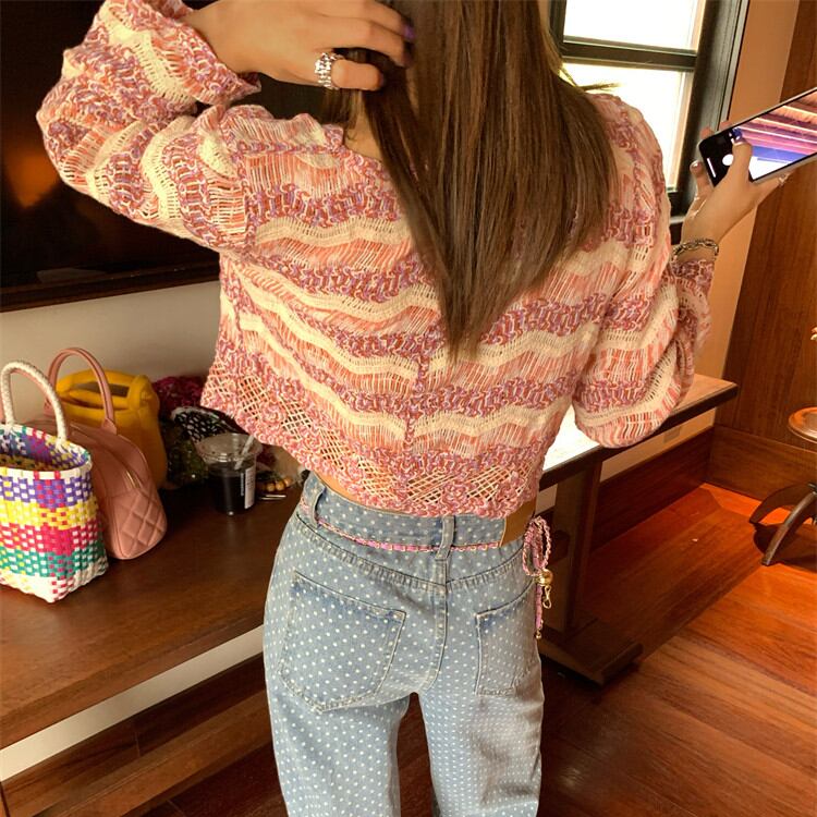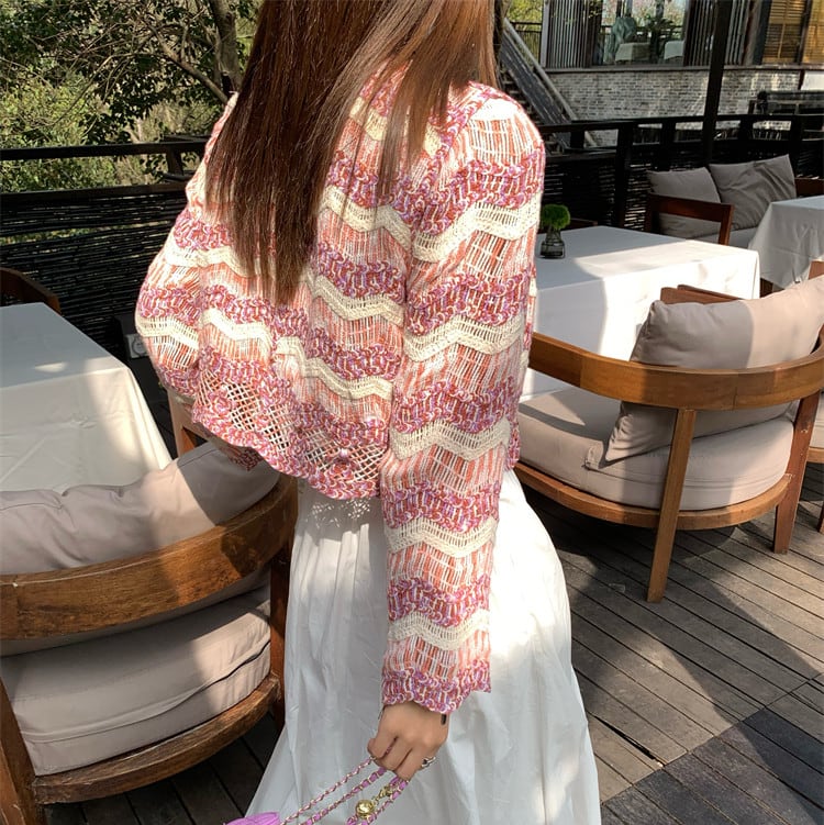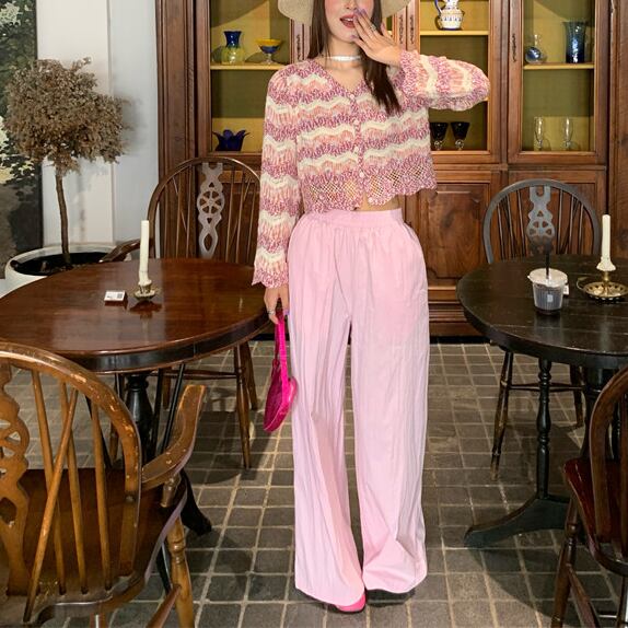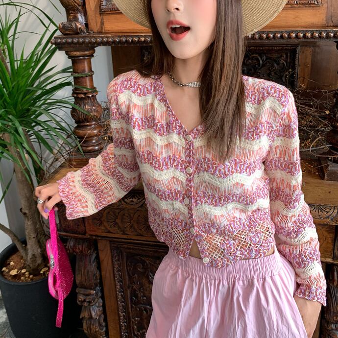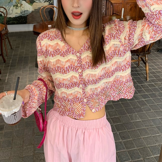 優しいピンクカラーと繊細なオープンワークが魅力のニットカーディガン。