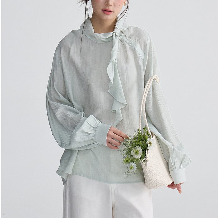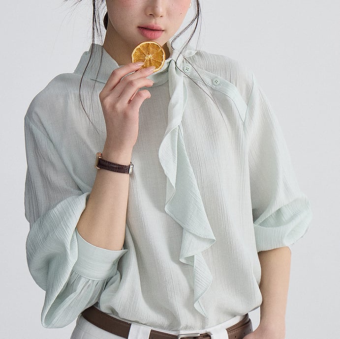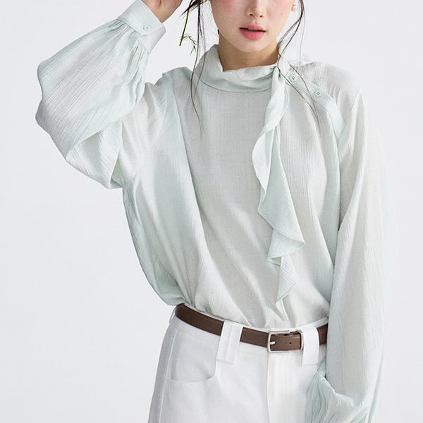 ラッフル×タイデザインにサイドボタンをプラスした、旬なディテールが詰まった一枚。