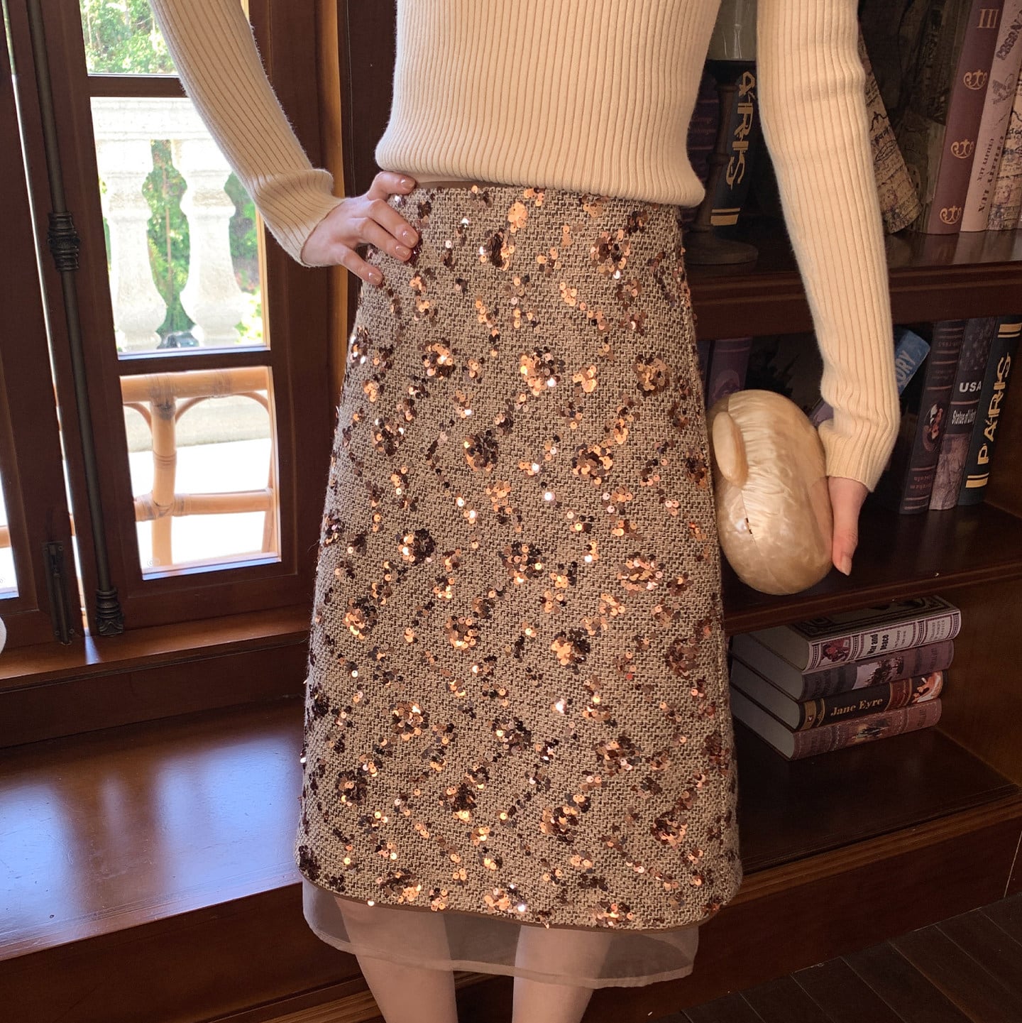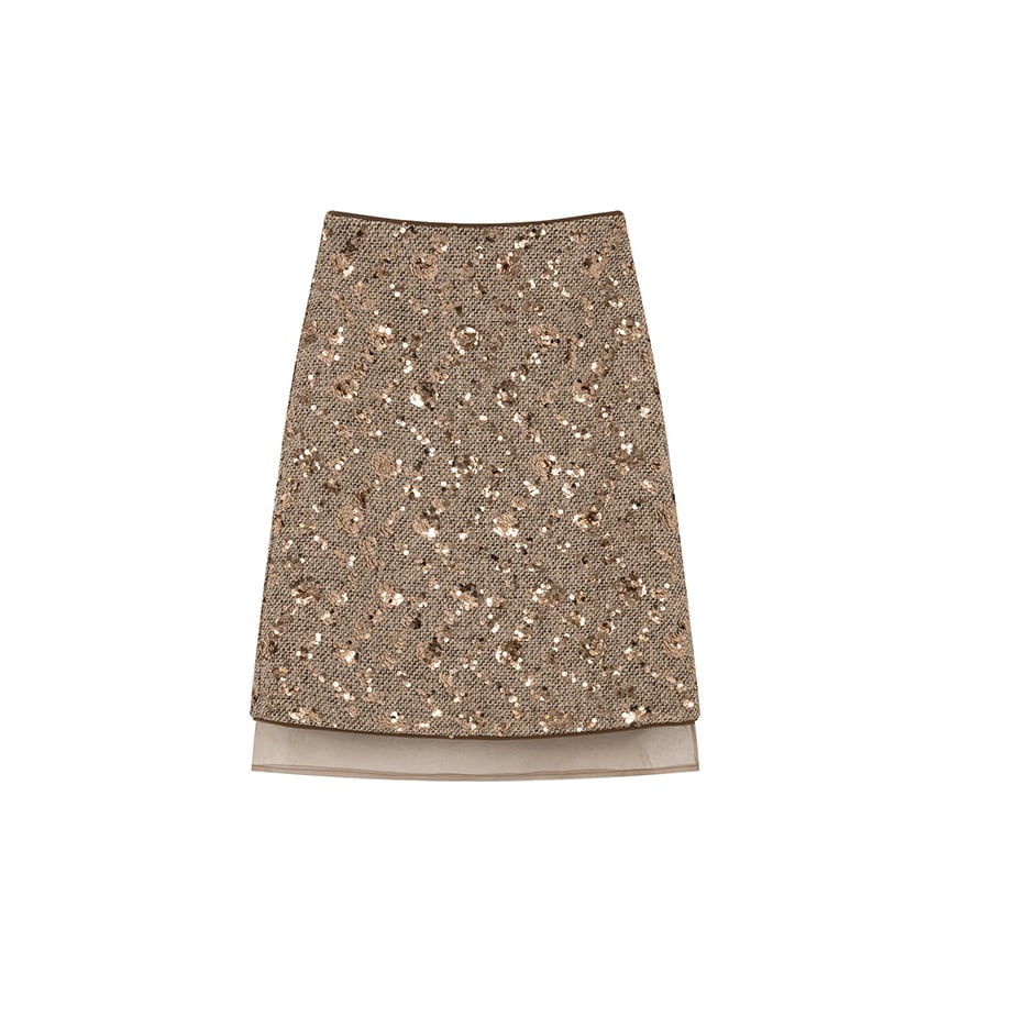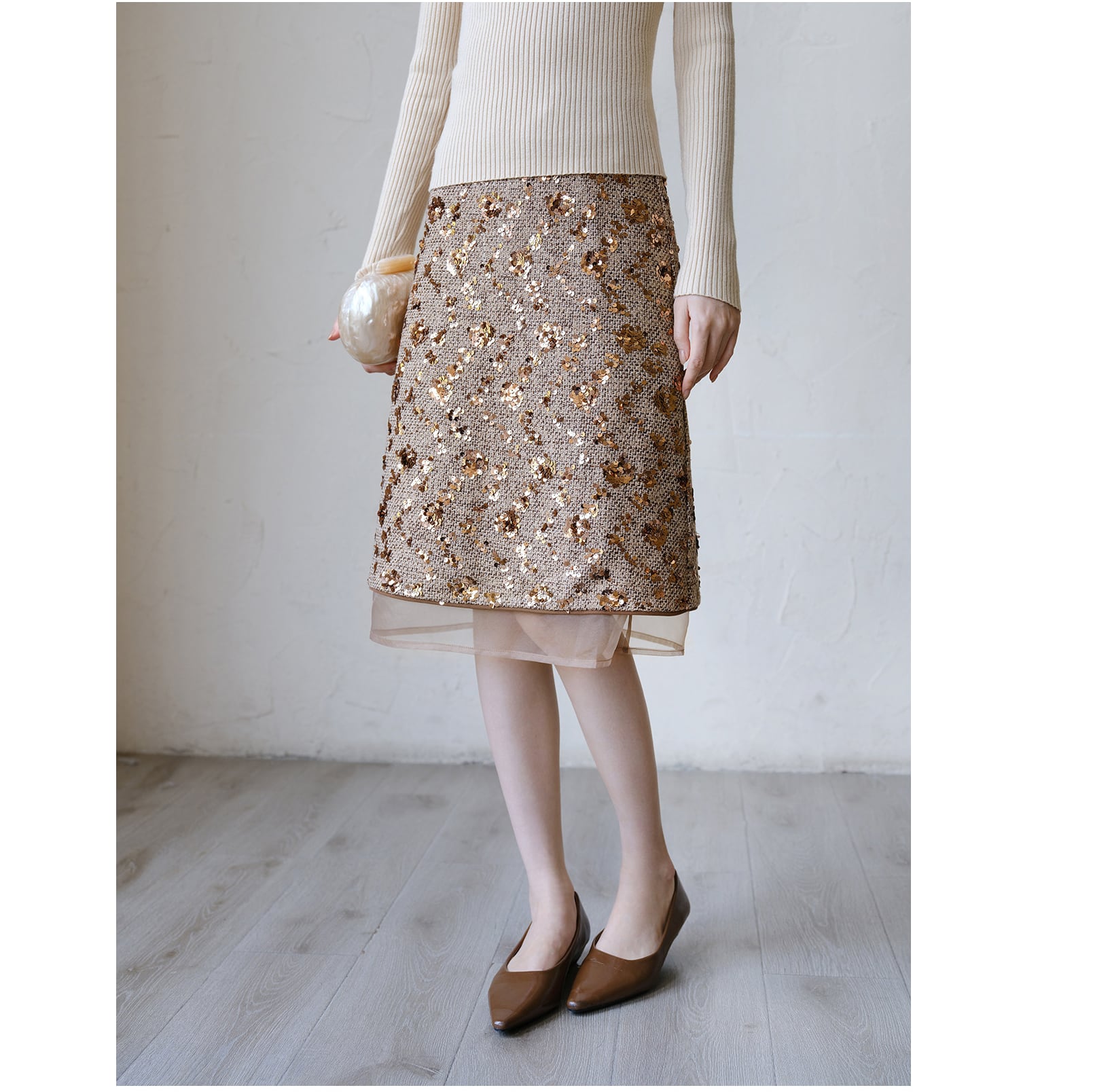 上品に輝くスパンコールが印象的な、洗練されたAラインミディスカート。