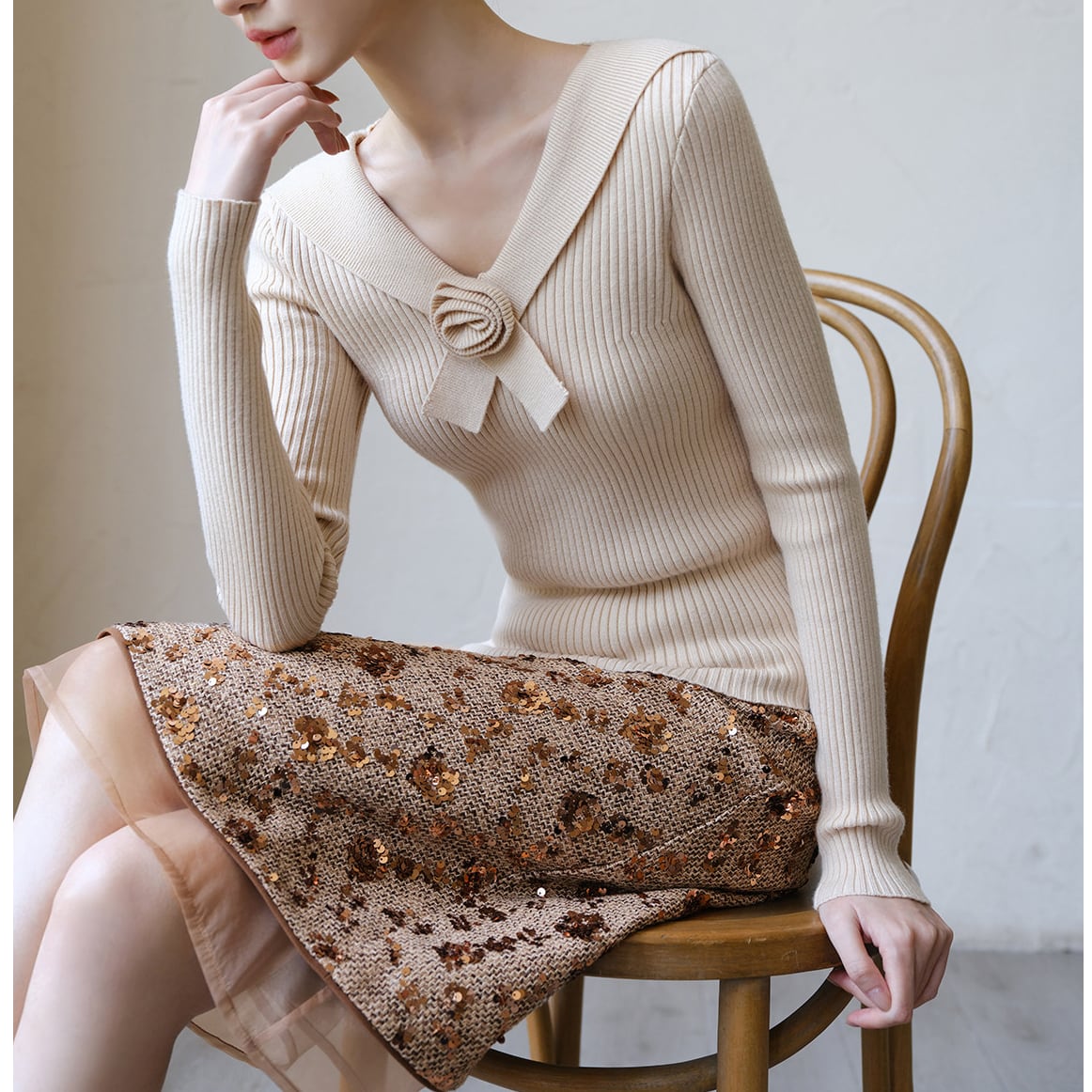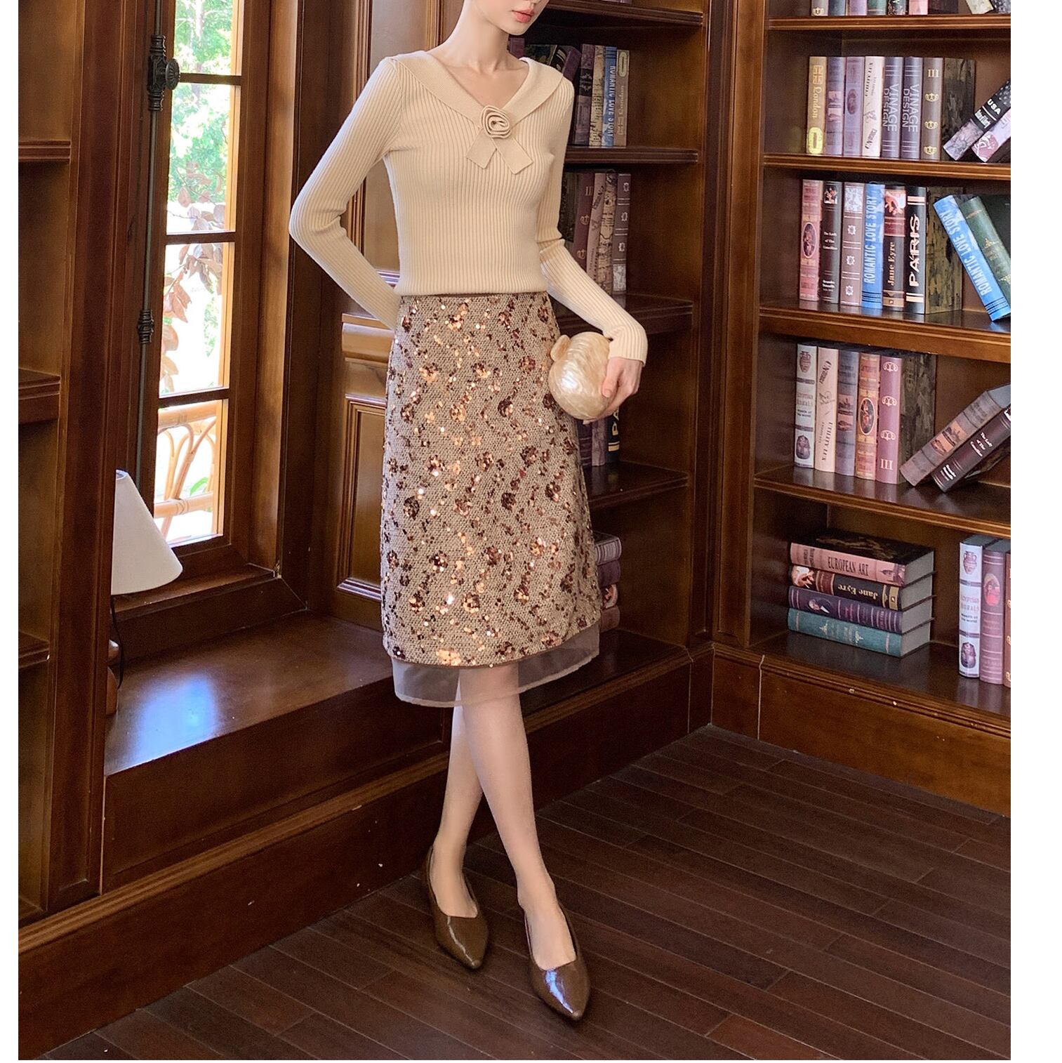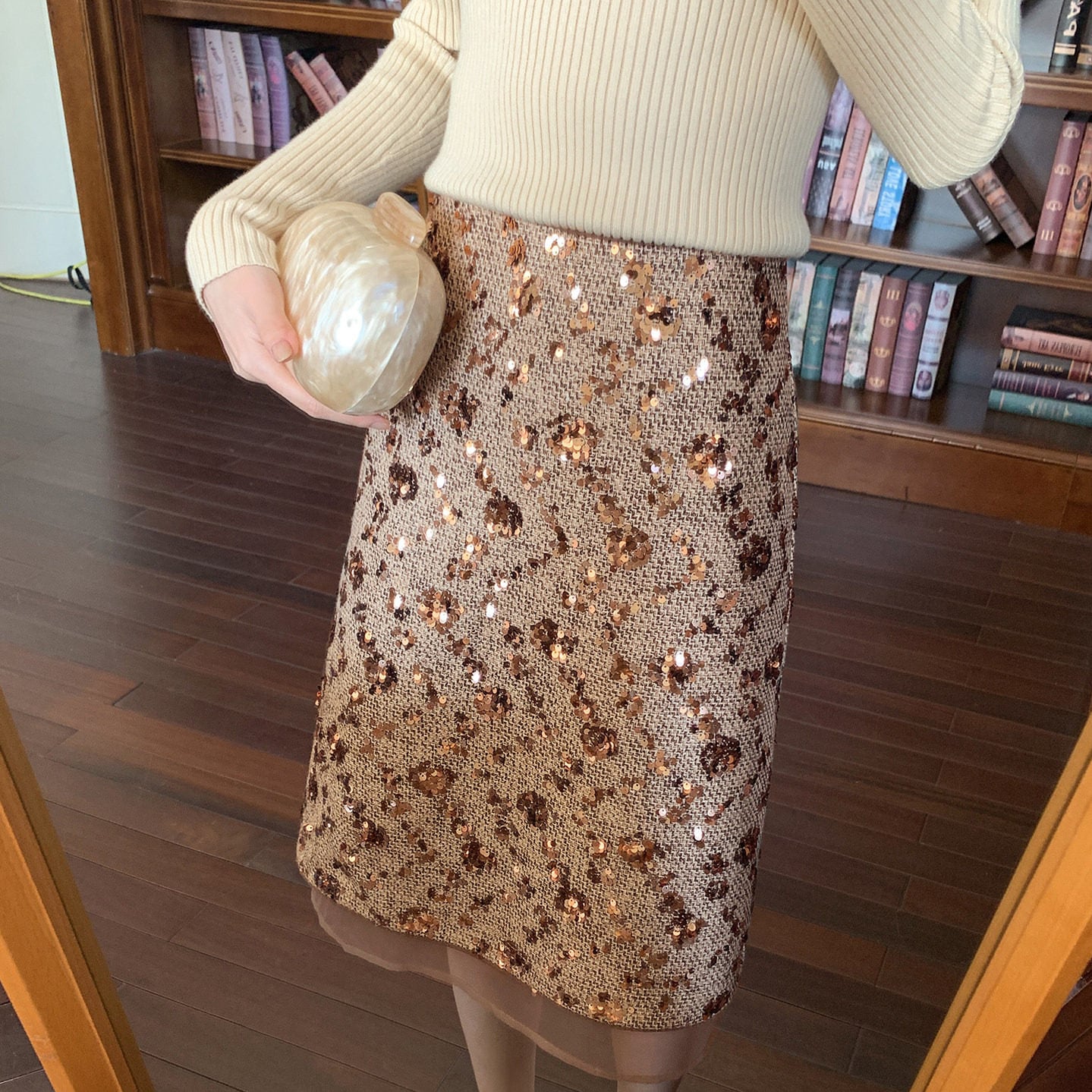 上品に輝くスパンコールが印象的な、洗練されたAラインミディスカート。