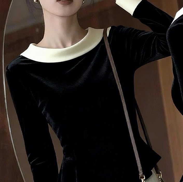 モノトーンのコントラストが際立つ、洗練されたクラシックトップス。