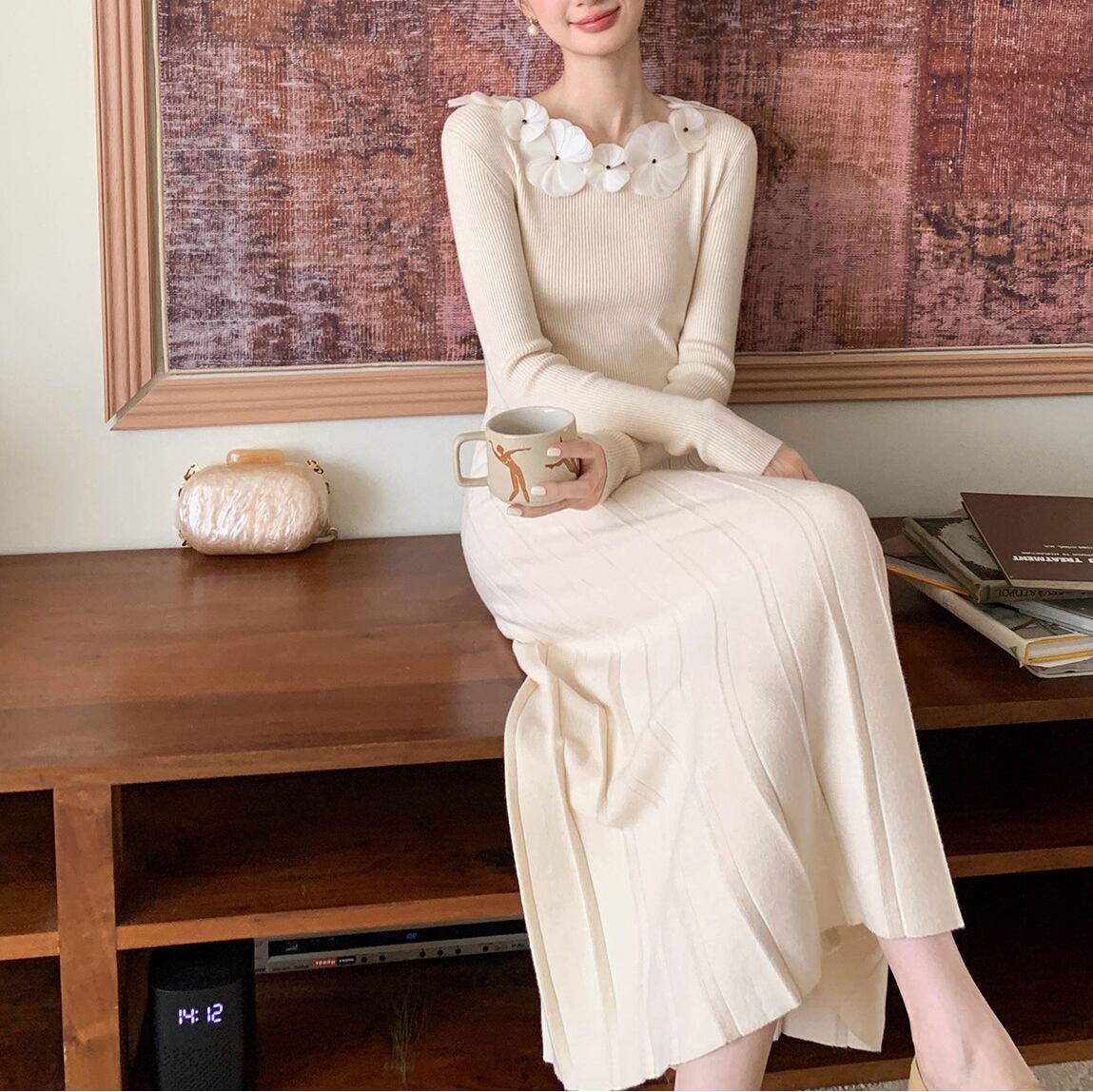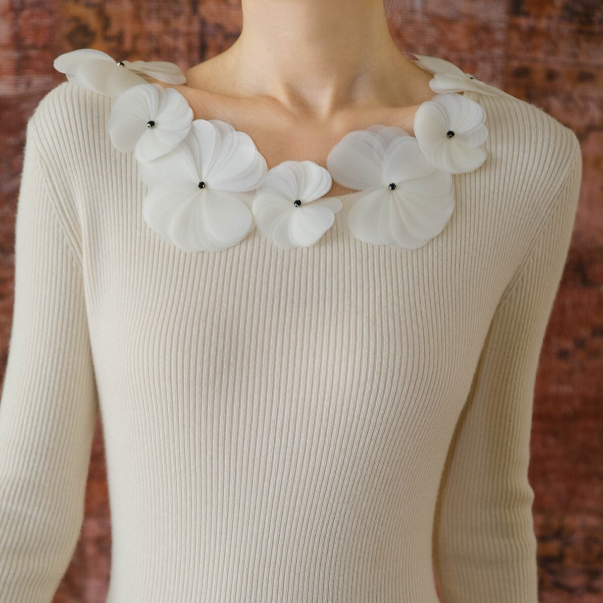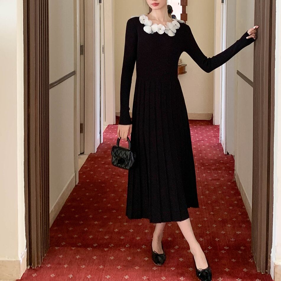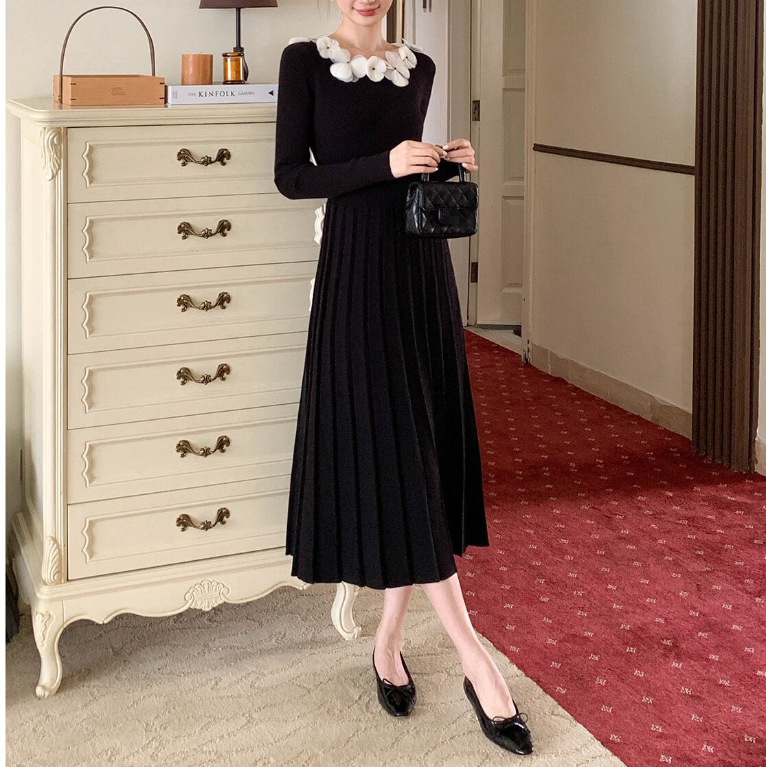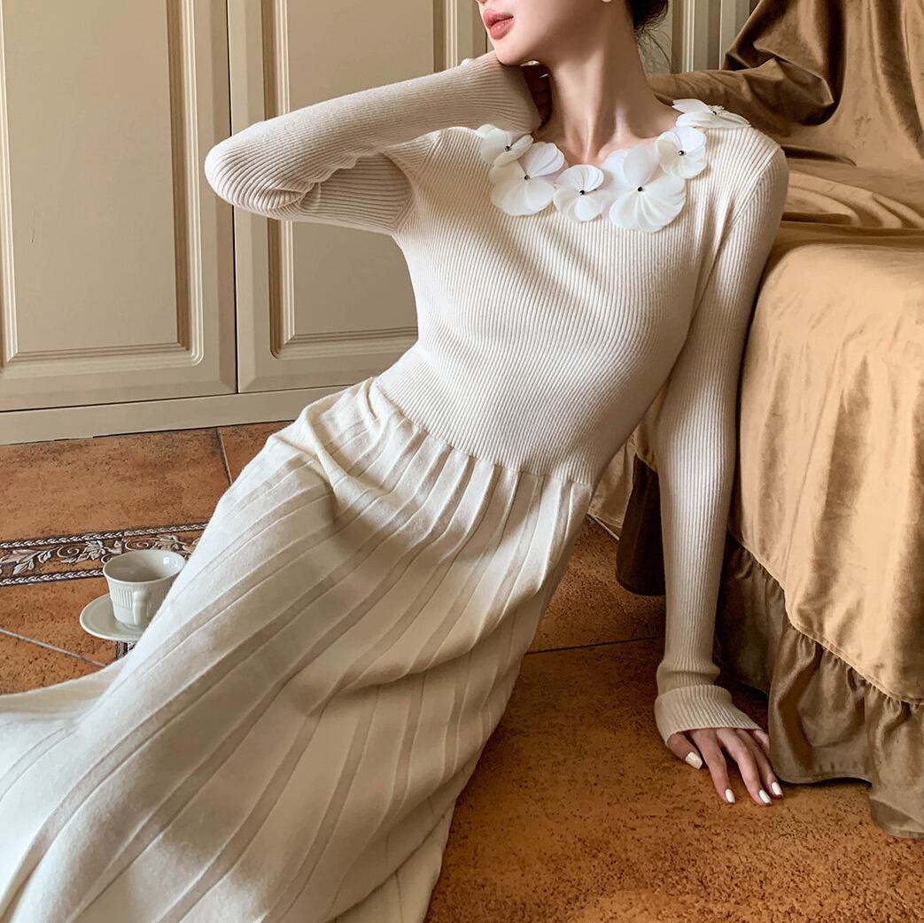 立体感のあるハンドメイドフラワーがアクセントになった上品なニットドレス。