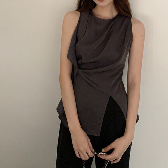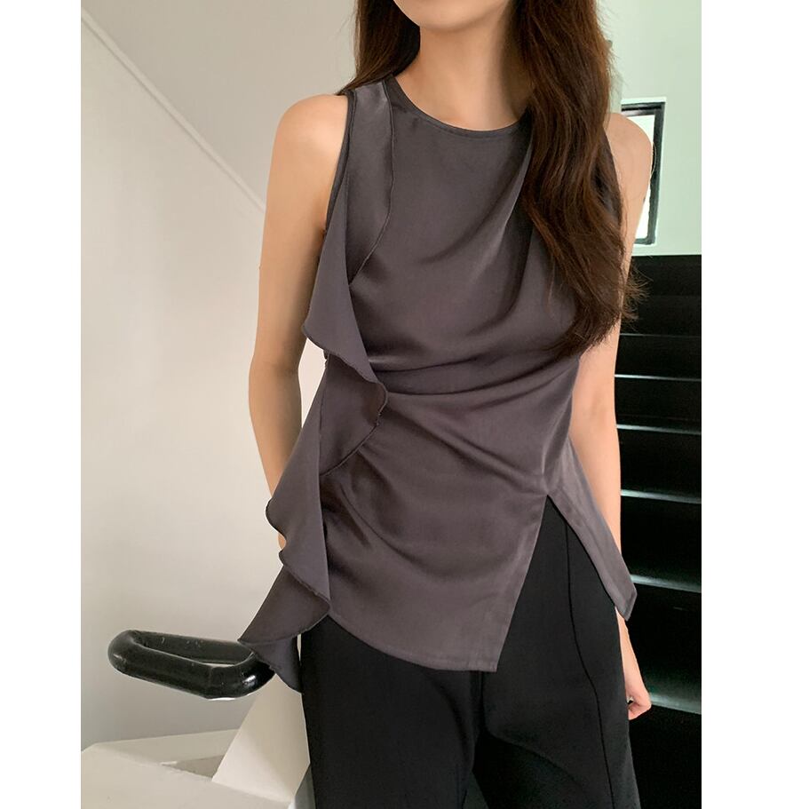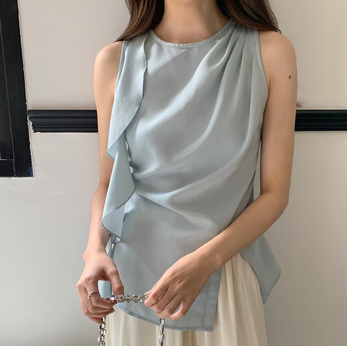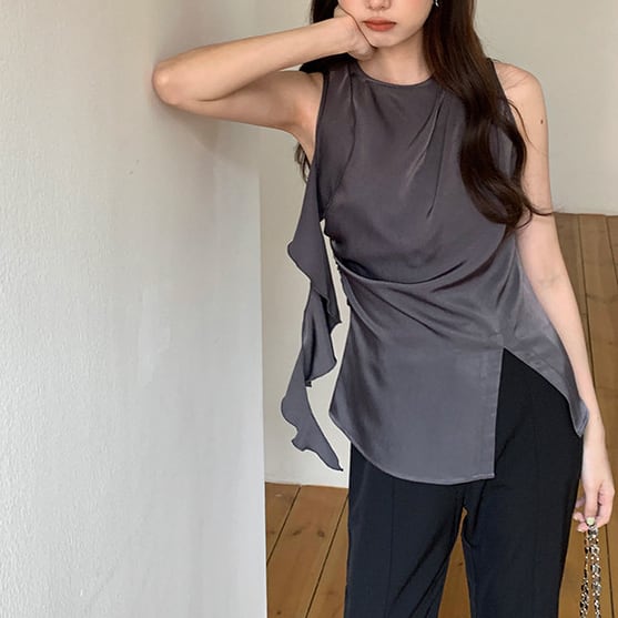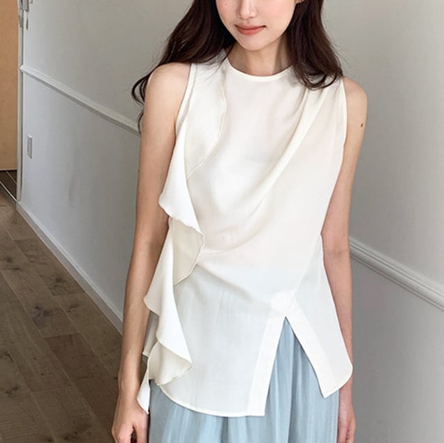 アシンメトリーなラッフルデザインが魅力のシフォントップス。