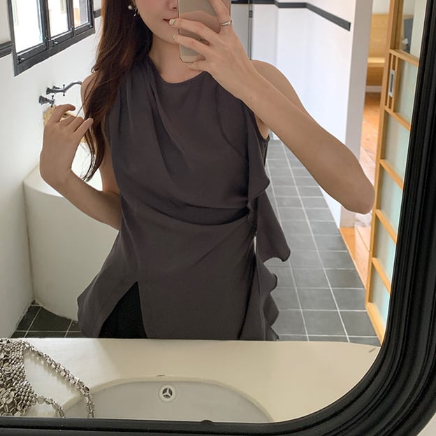 asymmetrical ruffle chiffon tie detail top(3color)<t3074>