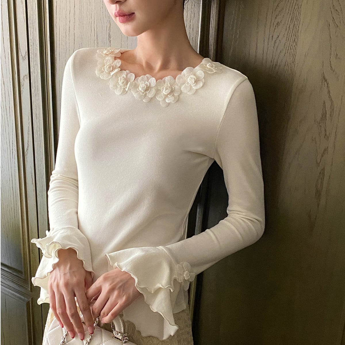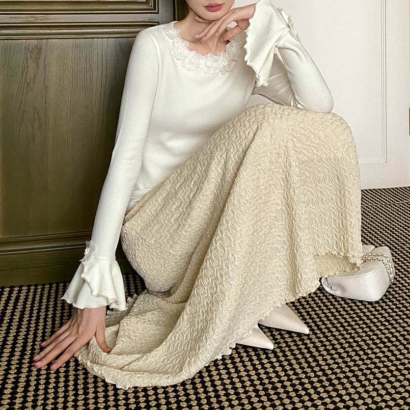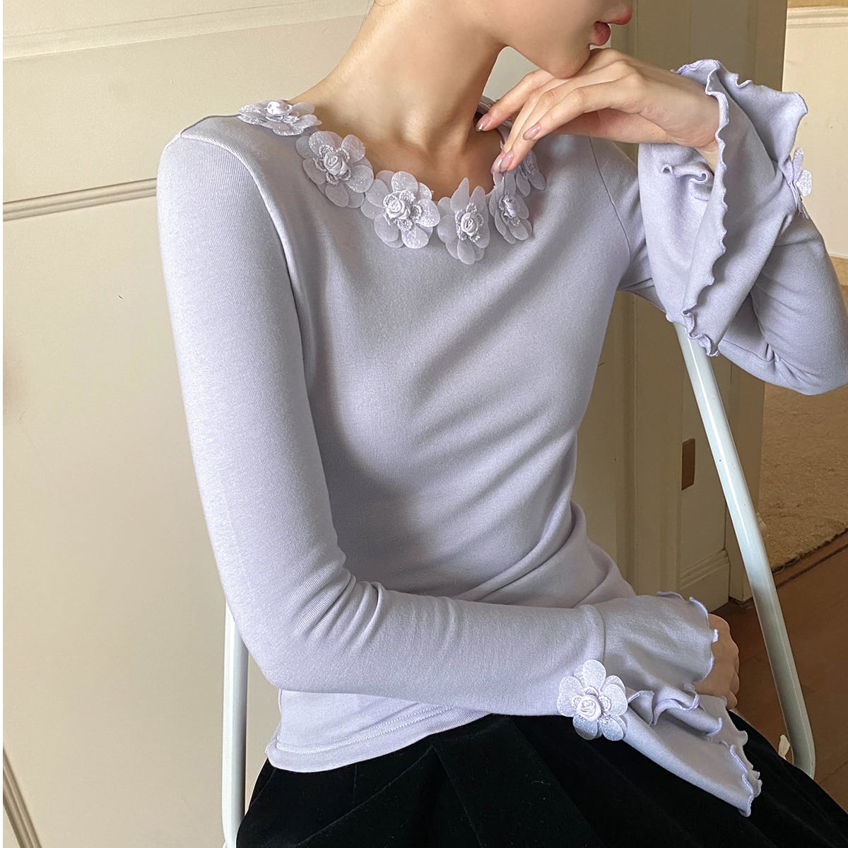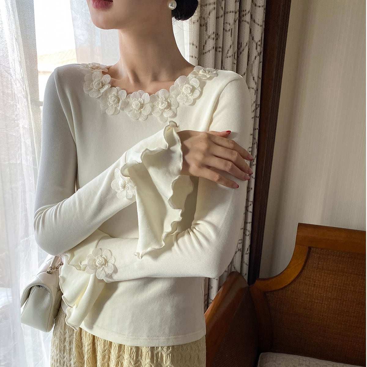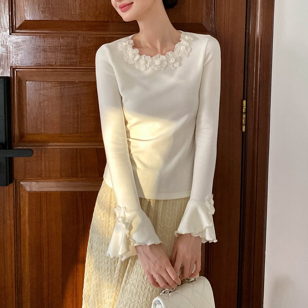 繊細なフローラルディテールをあしらった、フレンチムード漂うトップス。フレアスリーブが動くたびに優雅に揺れ、フェミニンで洗練された雰囲気に。