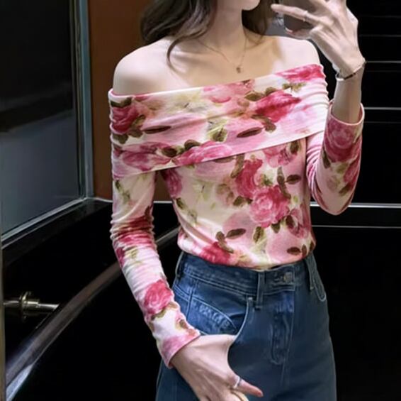 rose print off shoulderlong sleeve knit top<t3090>
