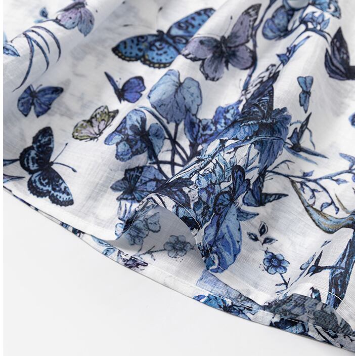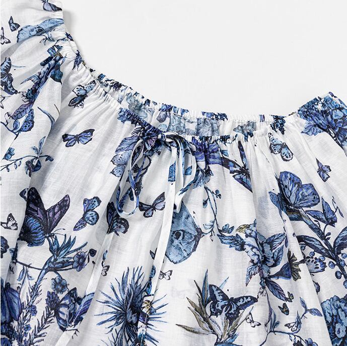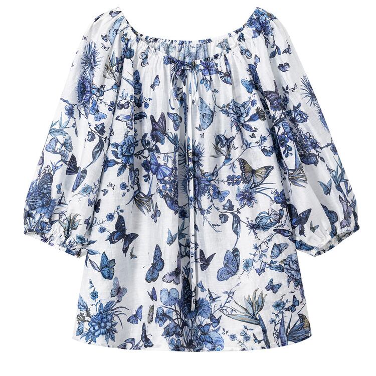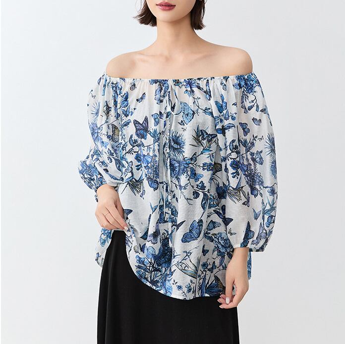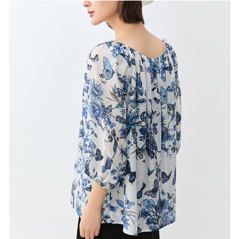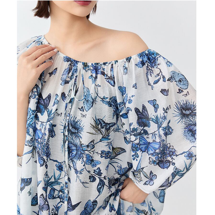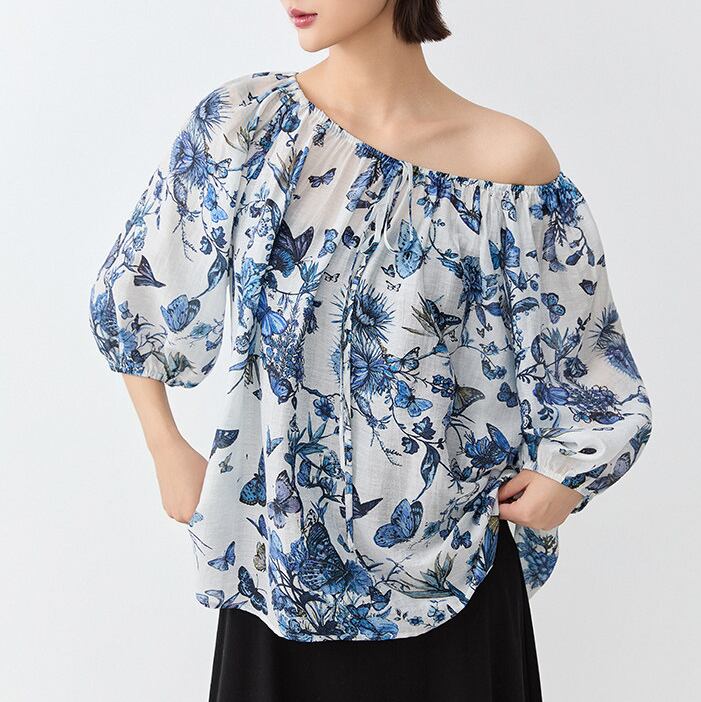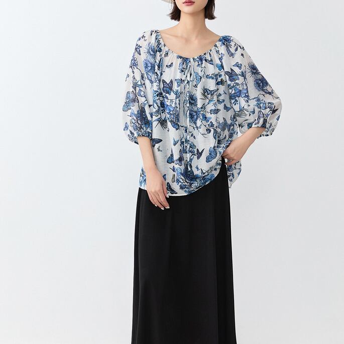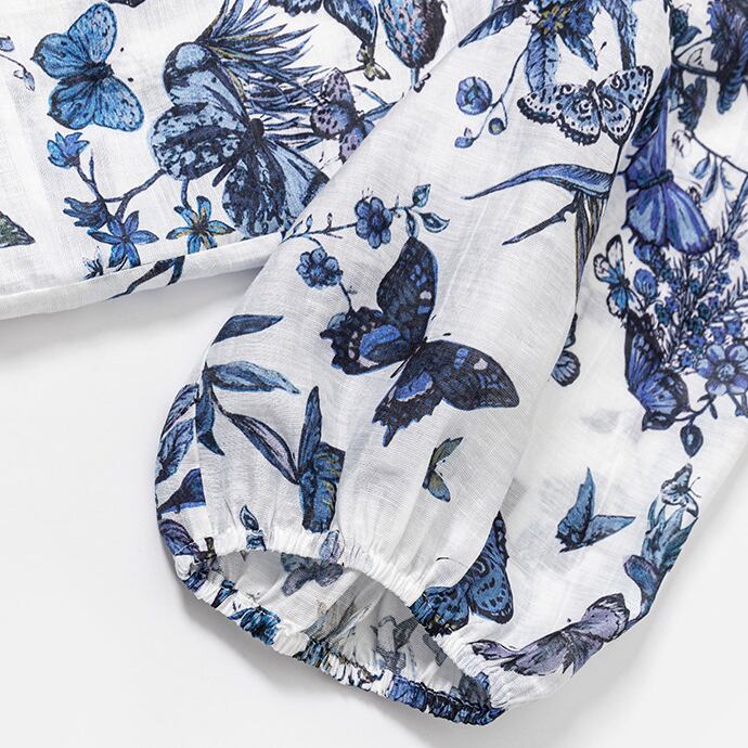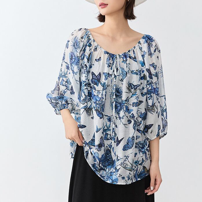 繊細なバタフライプリントが印象的な、大人っぽいブラウス。