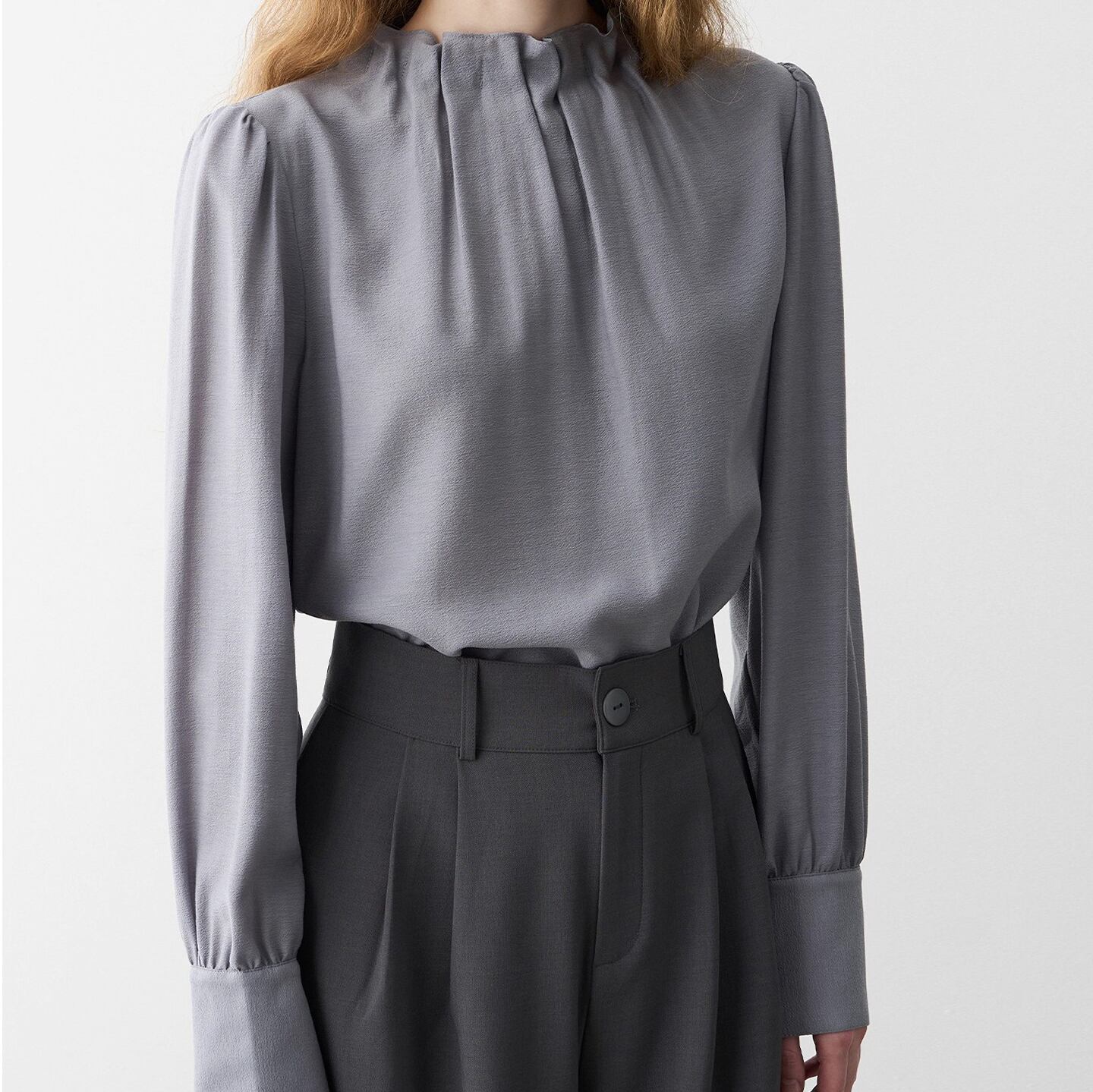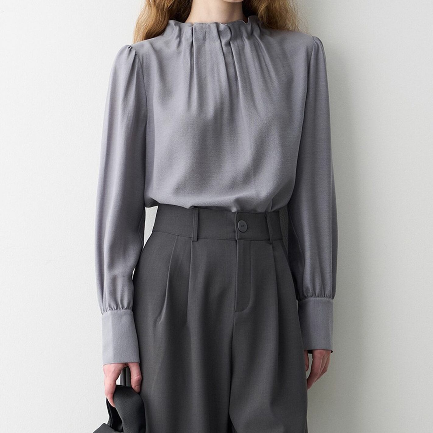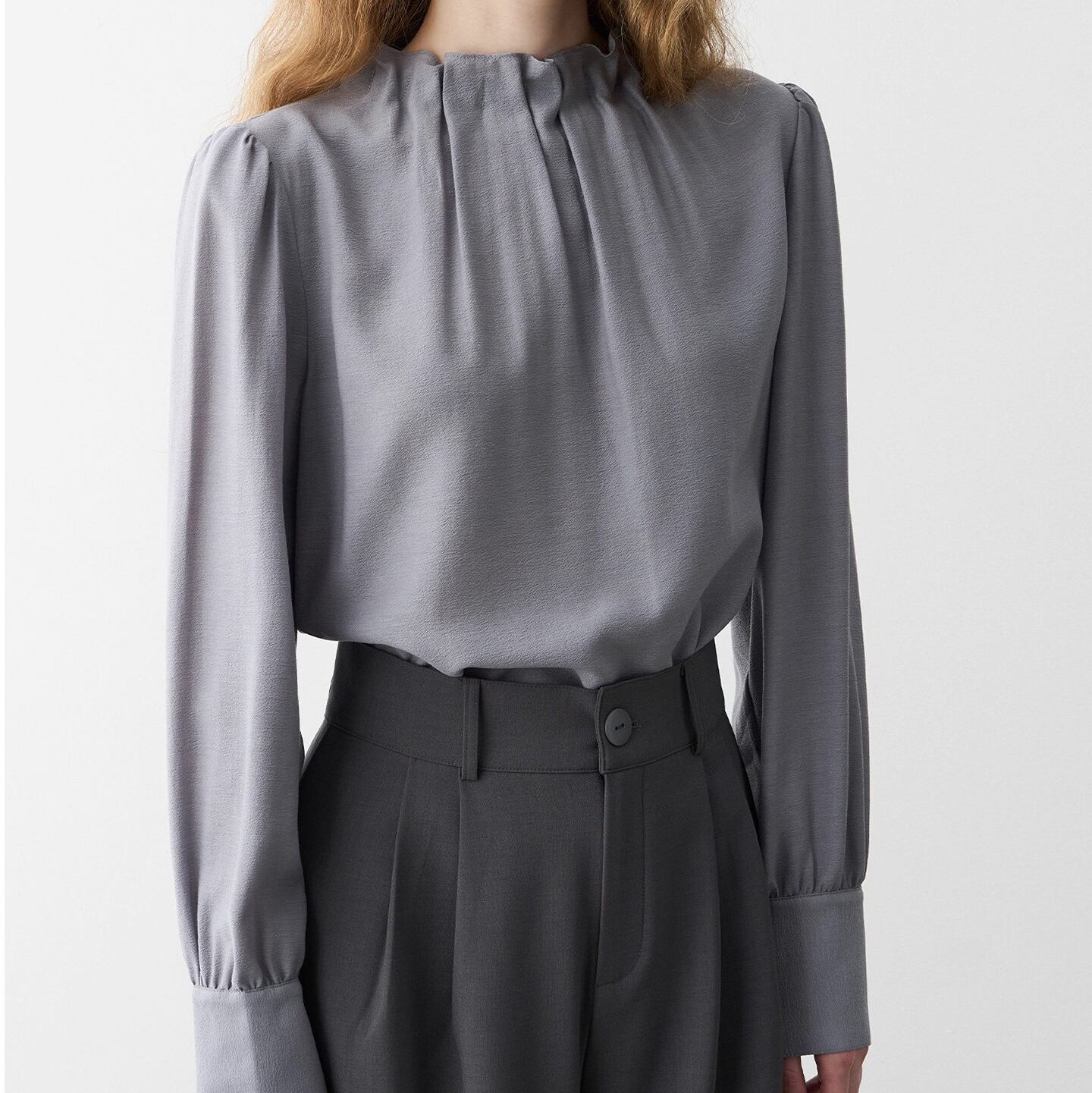 やわらかなニュアンスを纏う、グレーのスタンドカラ―シフォンブラウス。