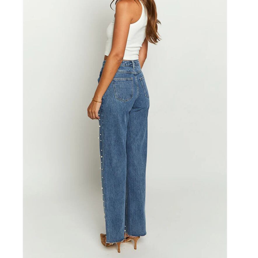 さりげない装飾が輝きを添える、ローヘムデザインのストレートレッグジーンズ。