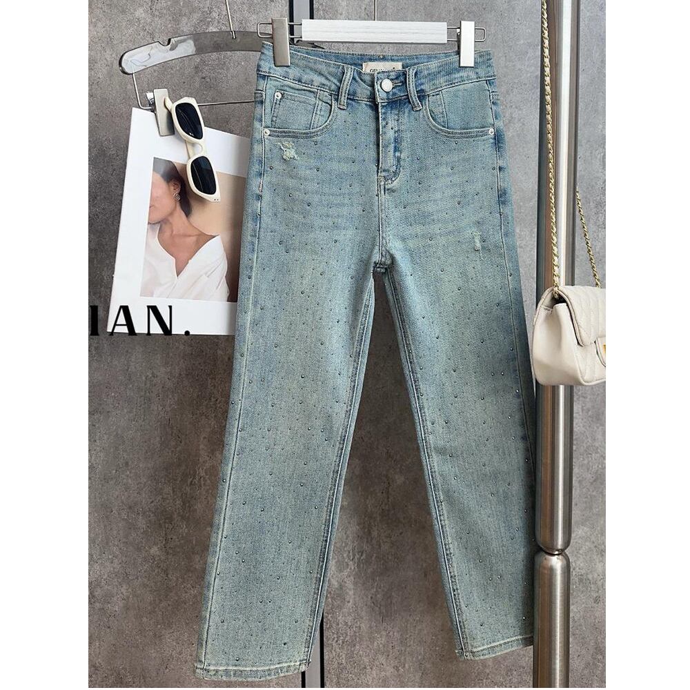 繊細なラインストーンがきらめく、ストレッチ素材のクロップド丈ストレートレッグジーンズ。動くたびにさりげなく光を放つディテールが、カジュアルなデニムに上品な華やかさを添えます。すっきりとしたストレートシルエットに、足首をのぞかせるクロップド丈で軽やかな印象に。