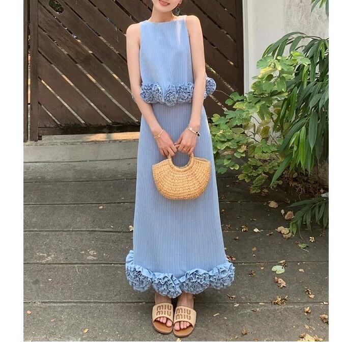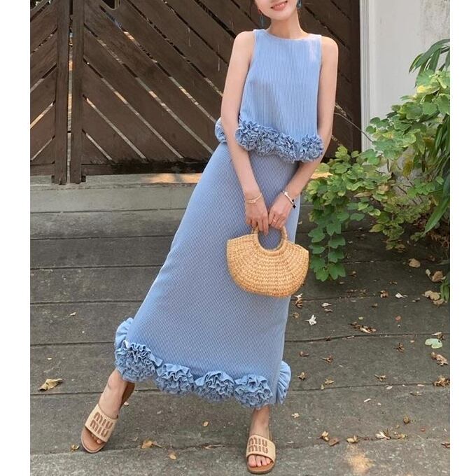 涼しげなブルーストライプが映える、セットアップ。