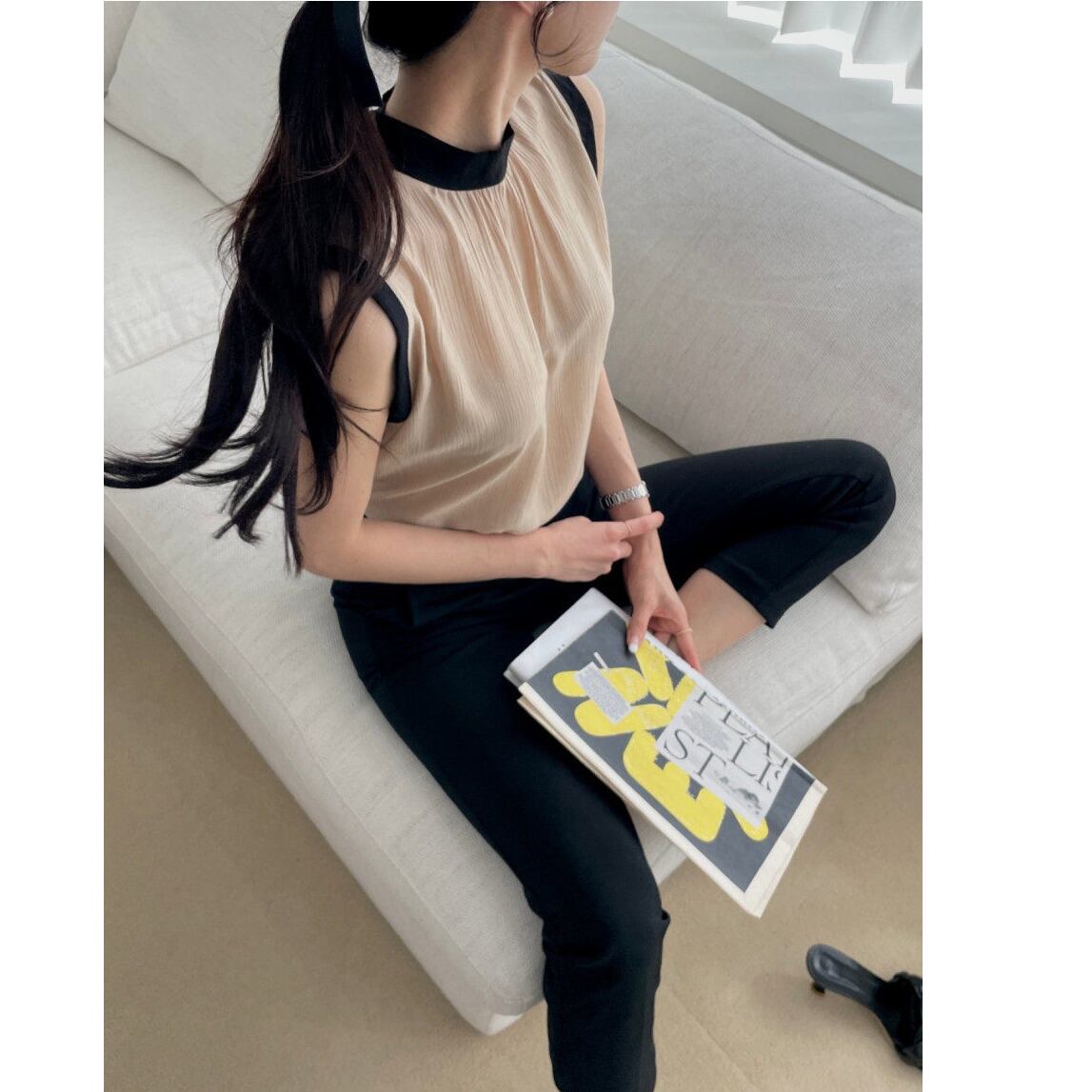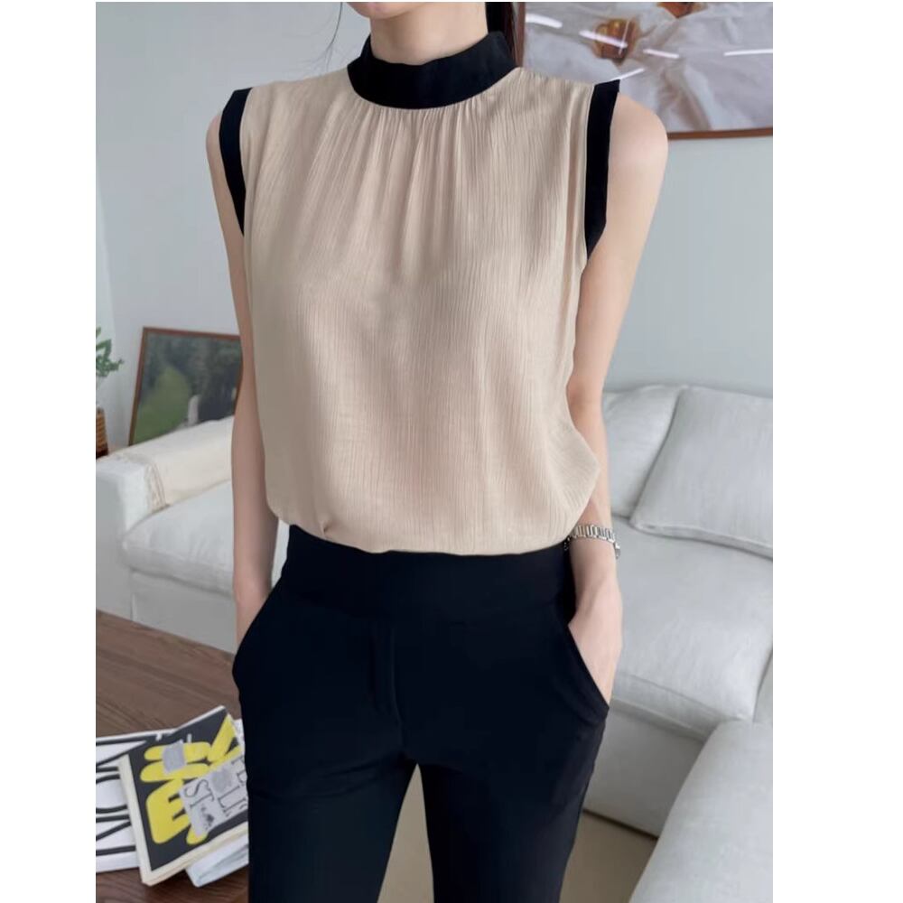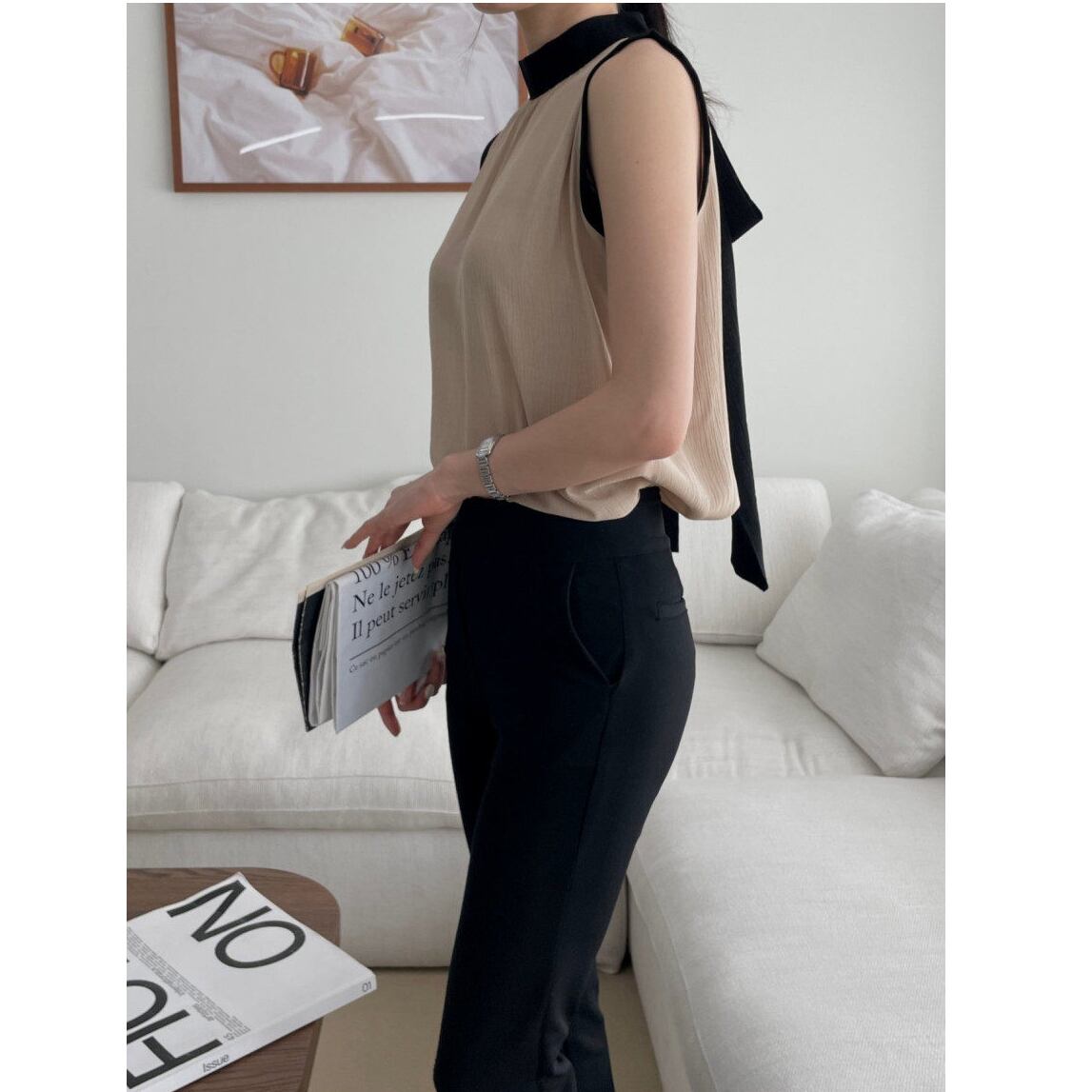 contrast color bow tie sleeveless blouse(2color)<t3122>