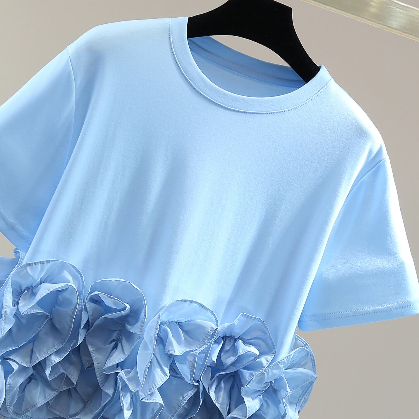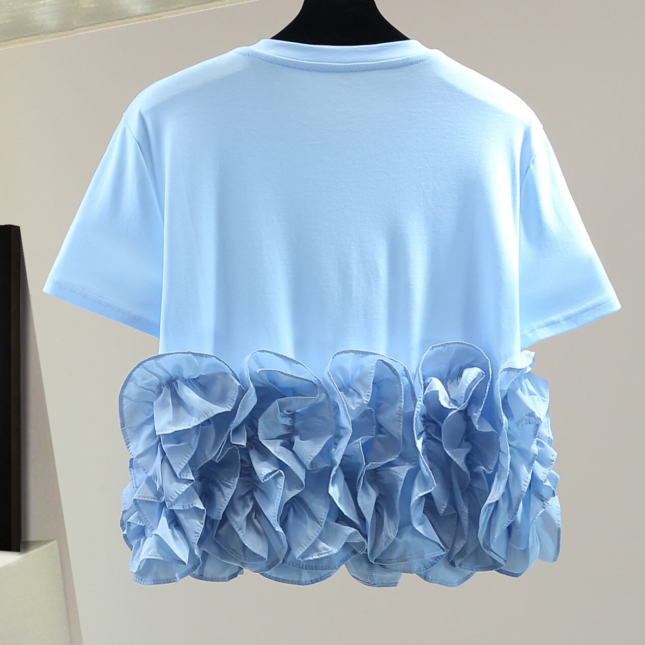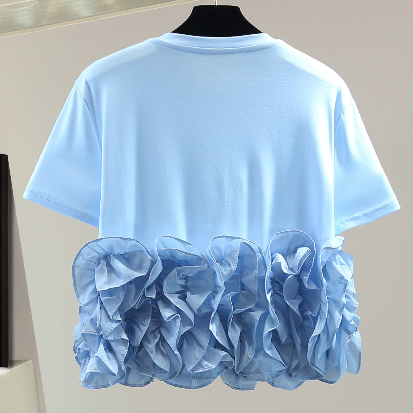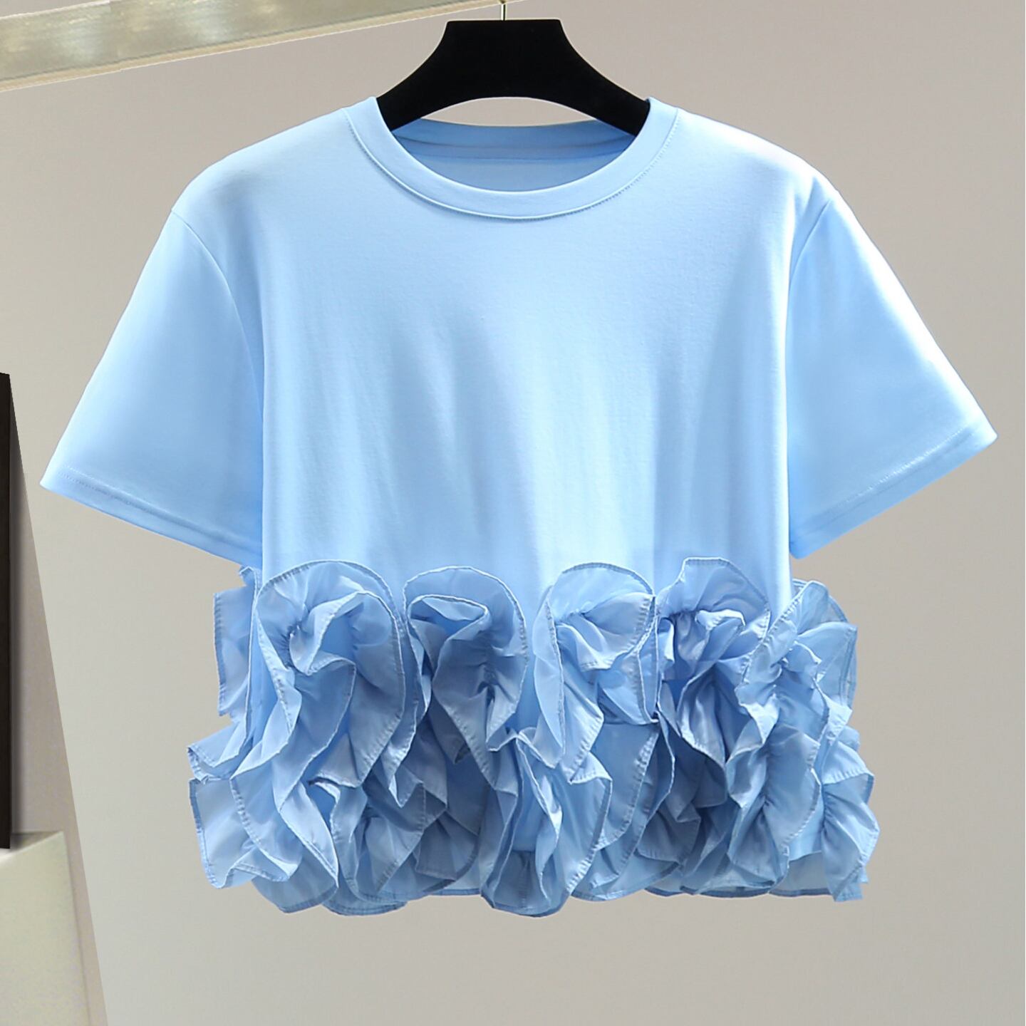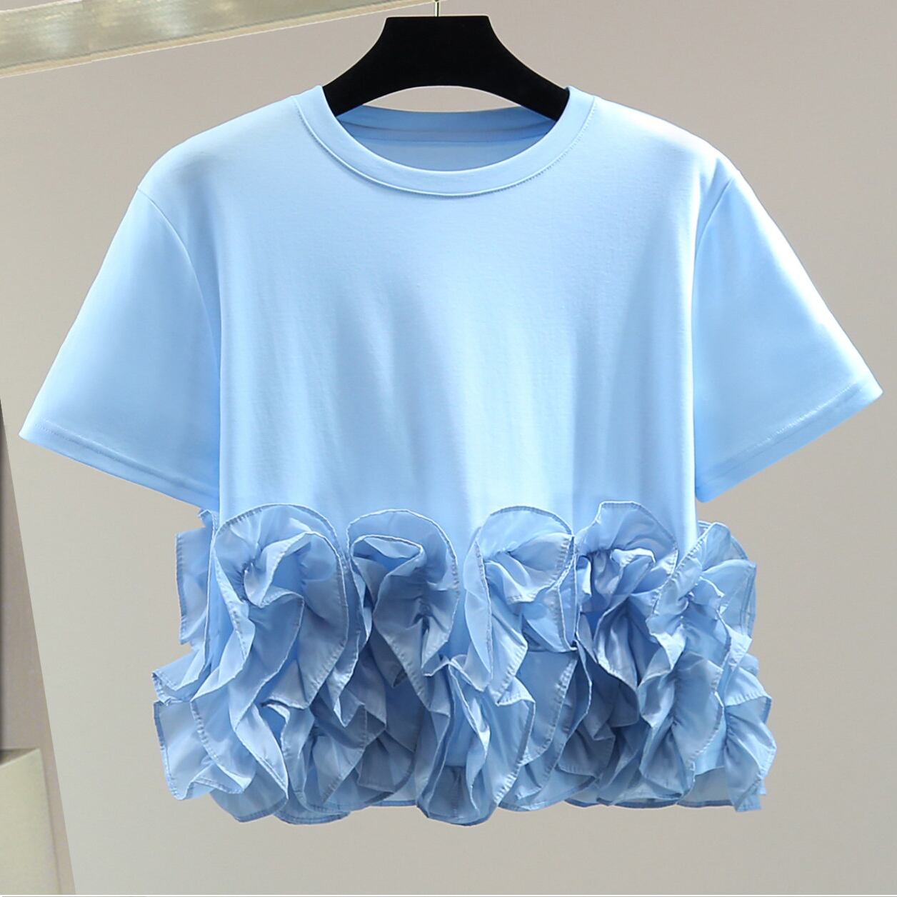 ruffle crew neck fitted cropped short sleeve t shirt<t3125>