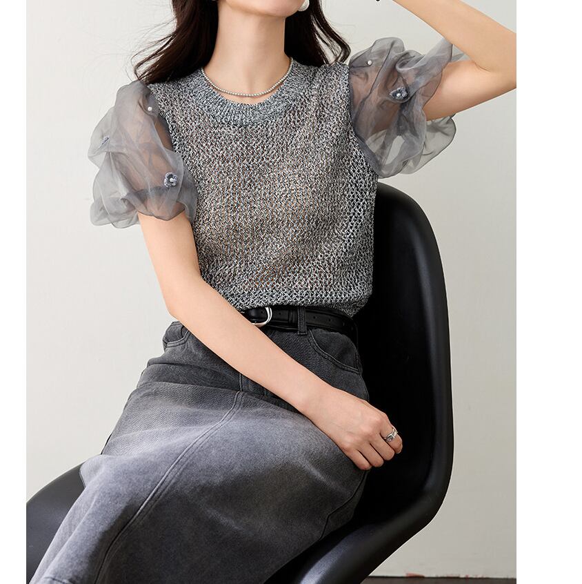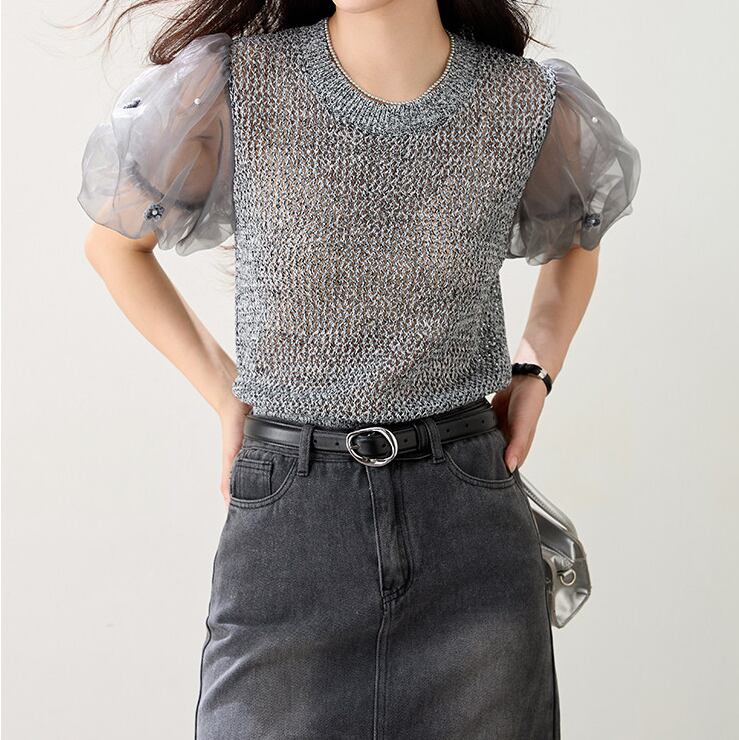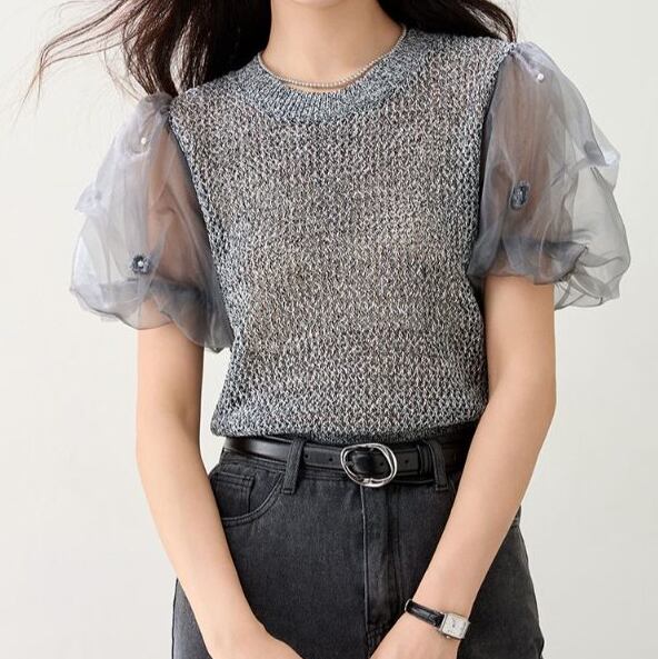 透け感のあるメッシュに、ふんわりとしたパフスリーブを組み合わせたフェミニンなニットトップ。華やかさと可憐さを兼ね備えた一枚です。