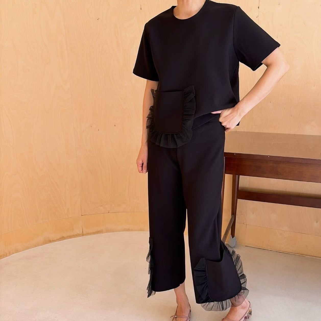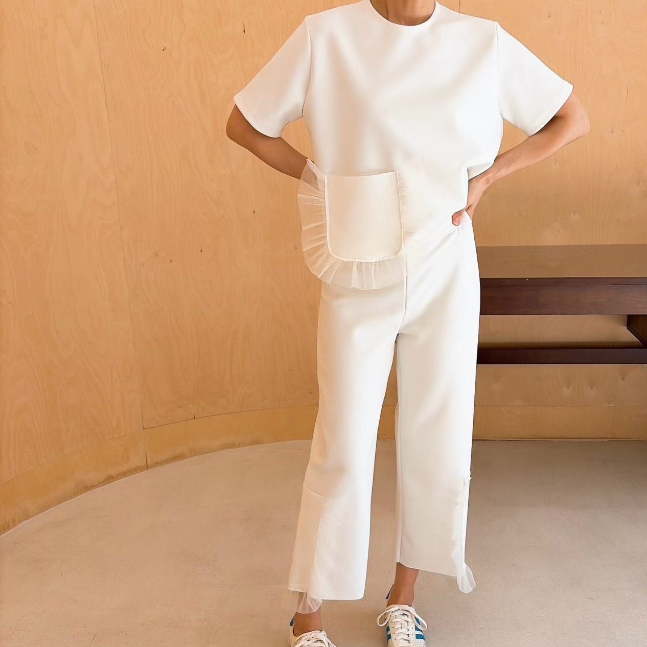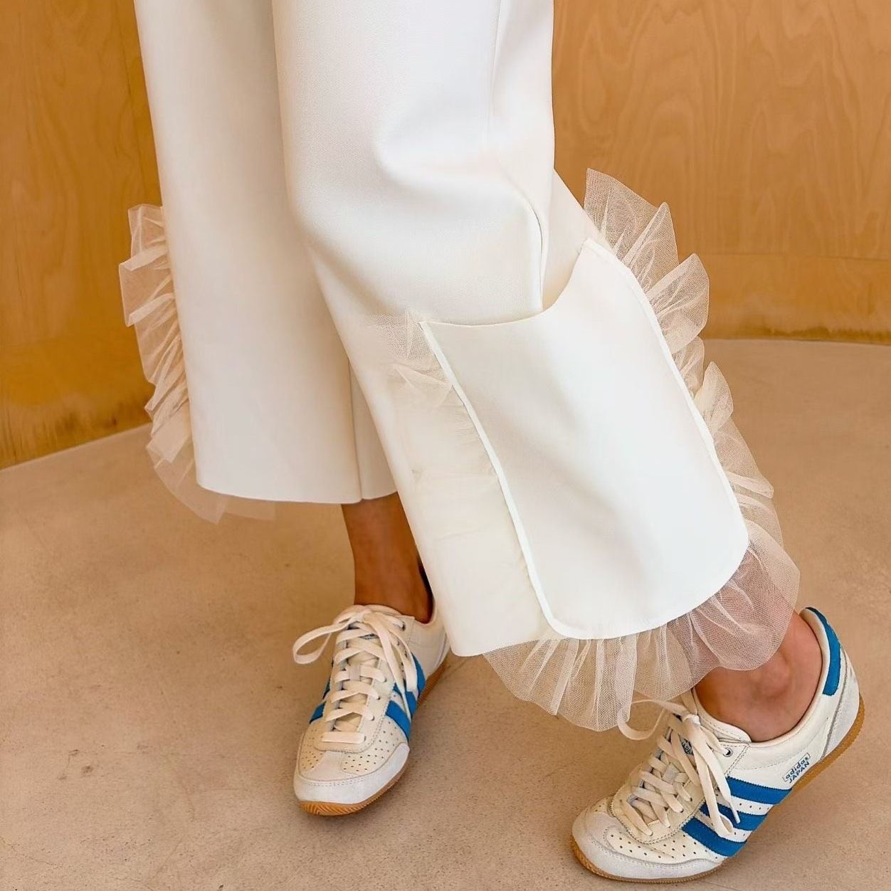 異素材のレースパッチワークが奥行きを生む、lace patchwork elastic waist casual pants。