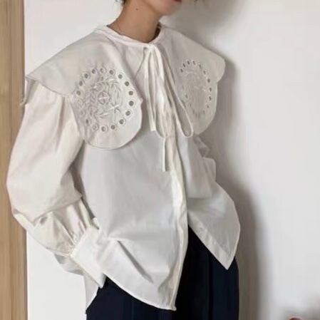 大きな襟のついたブラウス。模様の入った大きな襟がクラシカル。パンツに合わせても、ロングスカートの合わせても雰囲気がでます。お色はホワイトとブラックから選んでいただけます。