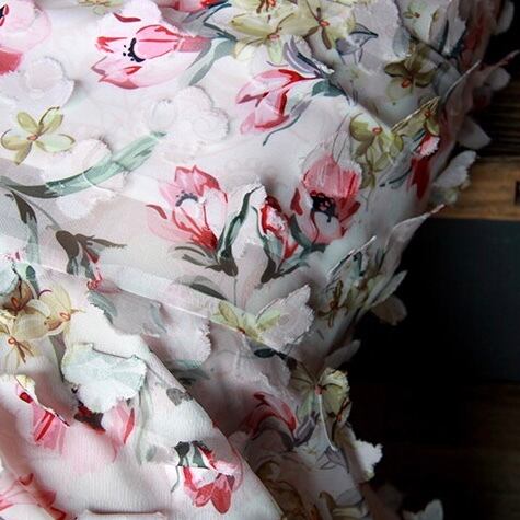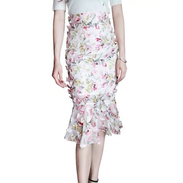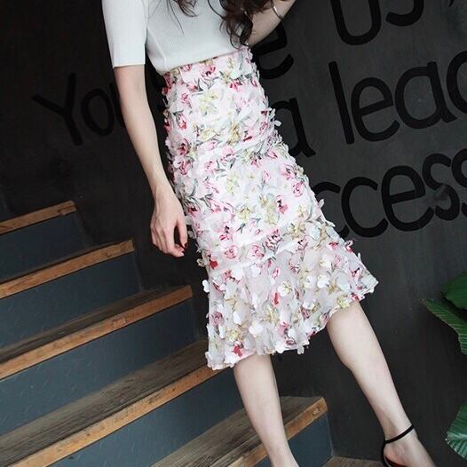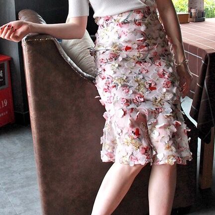 ふわふわの花びらがついているような華やかフラワースカート。マーメイドラインでエレガント。