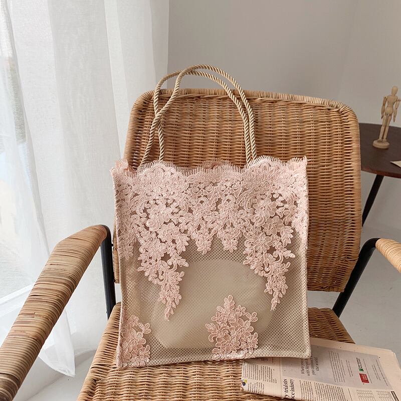 春夏にあう、涼しげなシースルーレースのバック。レースが花柄で華やかで、レトロキュート。あまりないデザイン。A4サイズが入り、使い勝手が良いです。