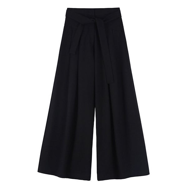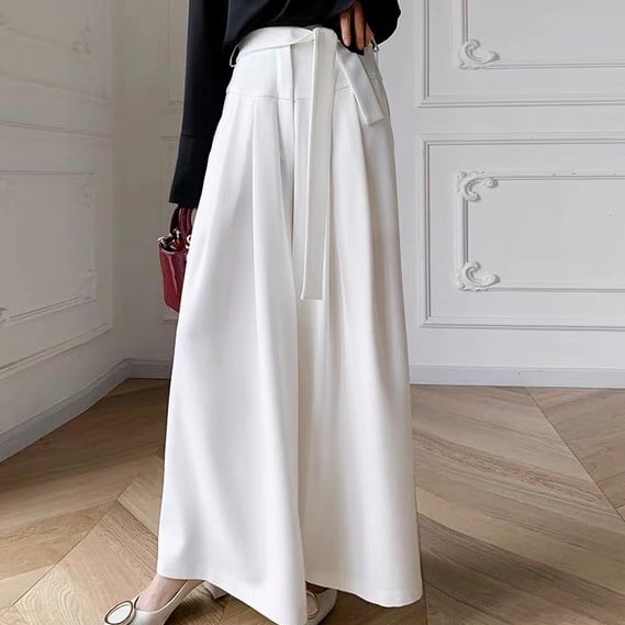 長さのあるワイドパンツ。サイドタイがポイントとなりエレガントです。モノトーンにすると大人シックでスタイリッシュになります。
