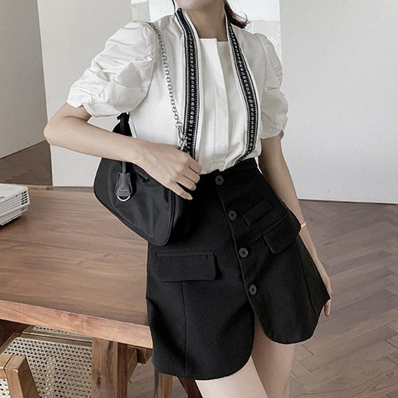 お袖はクシュッとしたパフスリーブ。リボン部分を垂らしてハイウエストのパンツにあわせると、おしゃれなサスペンダーパンツのようにみえます!