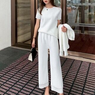 ホワイトステッチがキュートな3セットアップ。カーディガンと半袖トップス、パンツの3セットがお得です。半袖が肌寒い時はさっとカーディガンを羽織れ、季節にわたり長く使えます。ウエストゴムでリラックスできオフの日でもお出かけにも、オールマイティーなセットアップ。ブラックとホワイトから選べます。