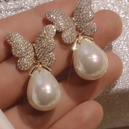 キラキラのバタフライのついたパール。大きめサイズで華やかです。バタフライの部分がキラキラしていてゴージャス。みていて楽しいデザインです。