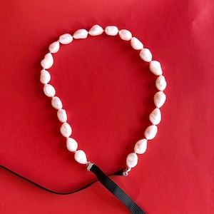 バロックパールが自然な表情をみせ、ブラックリボンがポイント。ブラックリボンを前や横に結んだり長さを調節でき、アレンジを楽しめます。