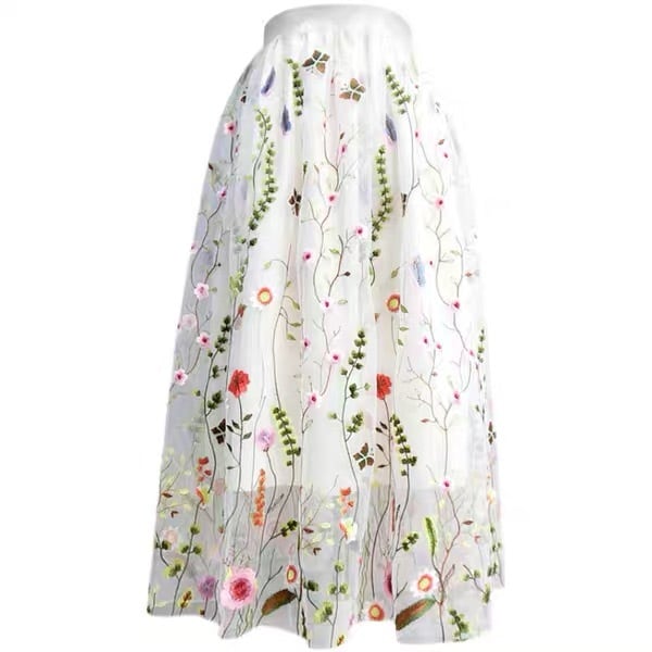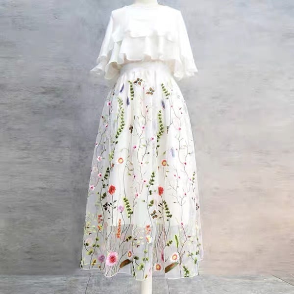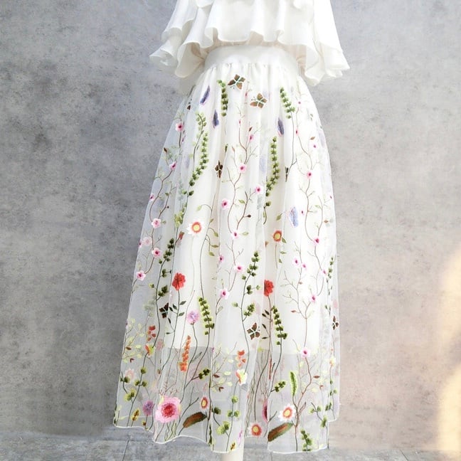 野の花や蝶々の刺繍のあるフレアスカート。ホワイト地でピュアな印象です。メシュにほどこされた刺繍が華やかでこっており鮮やかです。