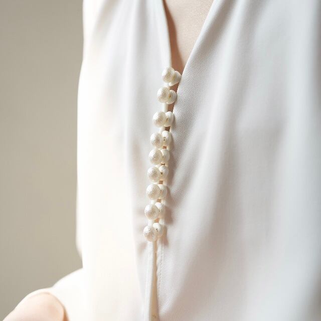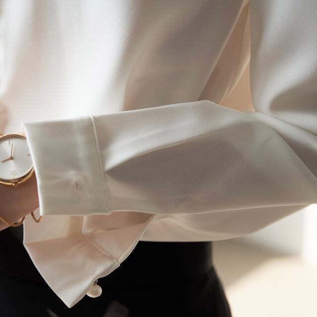 Vカットのネックラインと並んだパールがエレガントなブラウス。袖にもパールがついて上品。スーツにもあうブラウスです。
