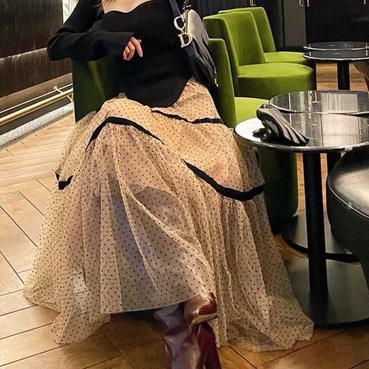 ドット柄のロングスカート。小さ目ドットと黒の切り替え部分がさりげなく可愛いデザイン。ロング丈でふわりと広がります。