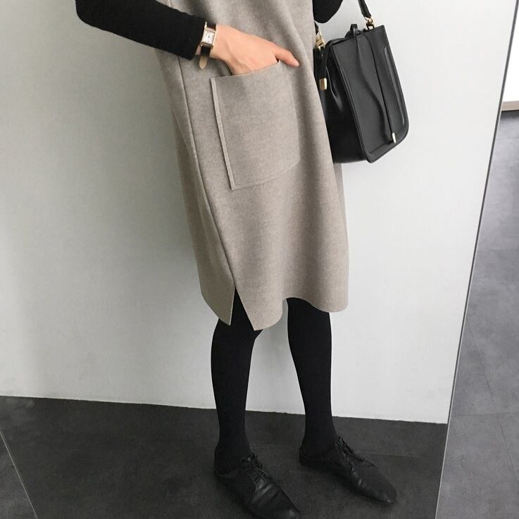 深めのVネックとサイドポケットがポントのワンピースです。ニットとあわせると素敵です。