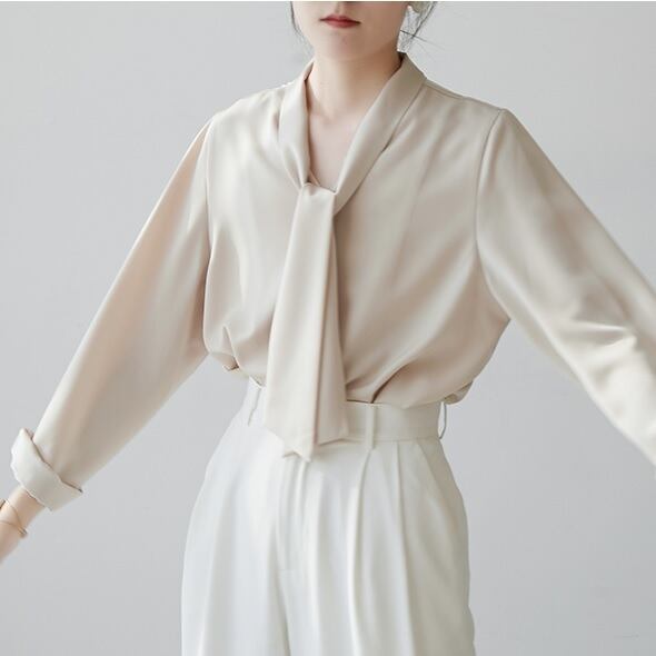お顔うつりの良い、柔らかい色のボウタイブラウス。