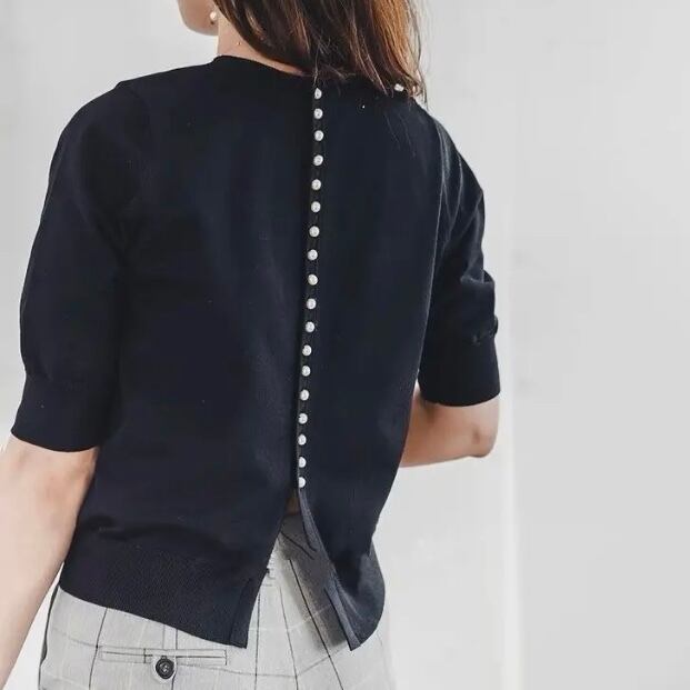 後ろ姿も華やかに演出してくれるパールボタントップス。