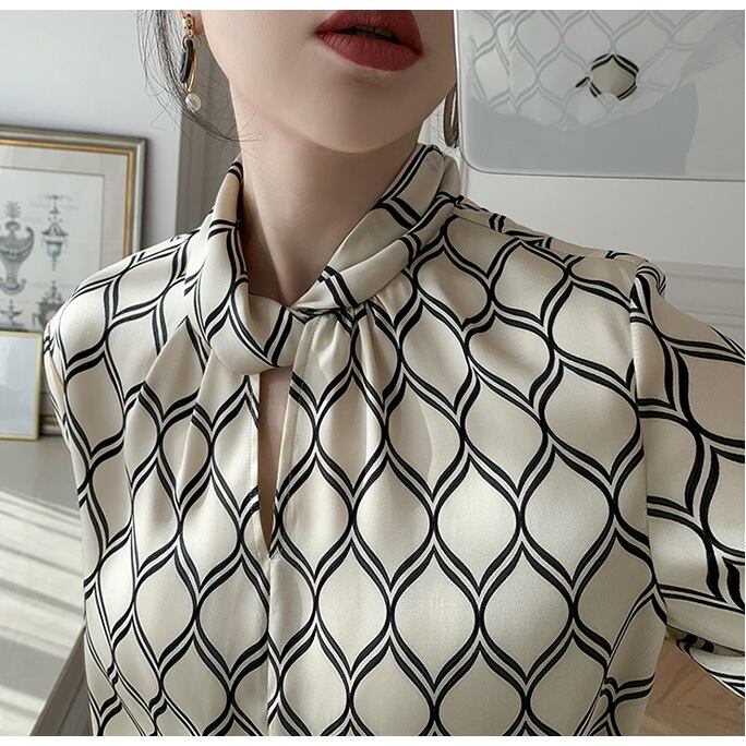 デザインネックがモダンで上品な印象のジオメトリー柄ブラウス。