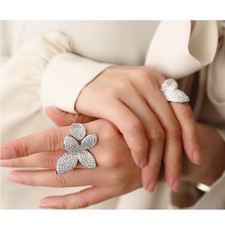 リーフやフラワーのボタニカルモチーフと煌びやかなビジューがマッチしたリング。