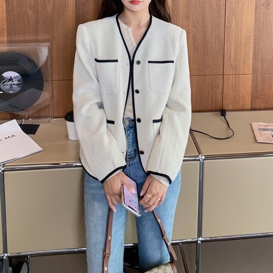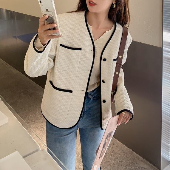 落ちついたバイカラーで仕上げたジャケット。パイピングがアクセント。