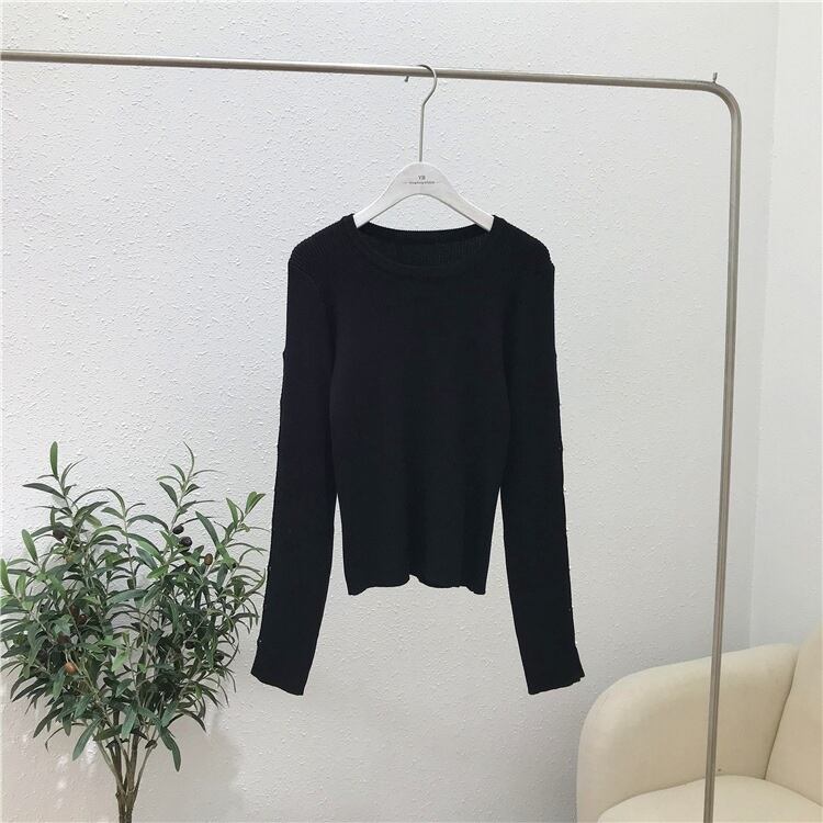 丸い襟がキュートなトップス。オフショルダーでヘルシーな印象。