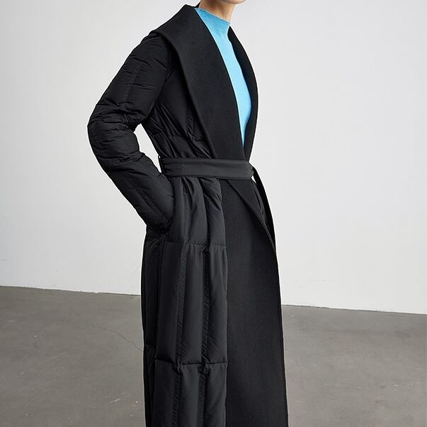 長めの襟とコート部分の異素材の組み合わせが、シックで凝ったデザイン。