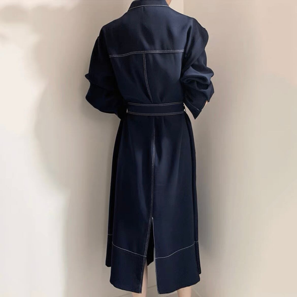 パイピングがアクセントのシャツ型ワンピース。