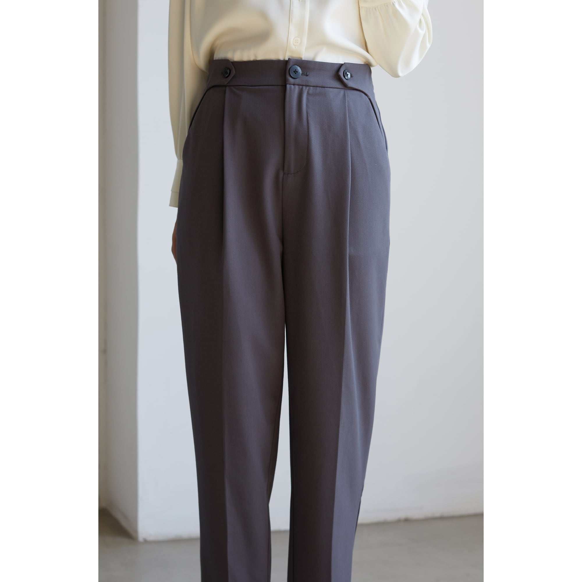 シックでシンプルなデザインのハイウェストパンツ。様々なトップスにあわせやすく、タックインしてもきまります。
