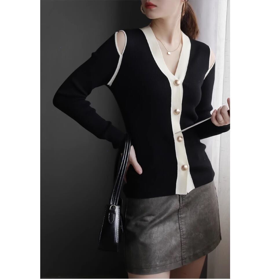 ショルダースリットがアクセントのバイカラーカーディガン。