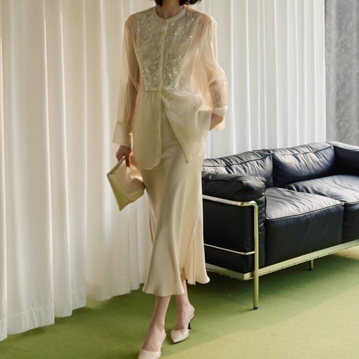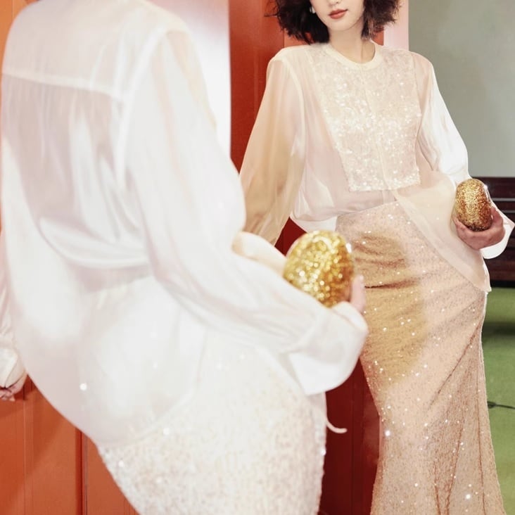 long sleeve sequin blouse with sheer sleeves<t1999>